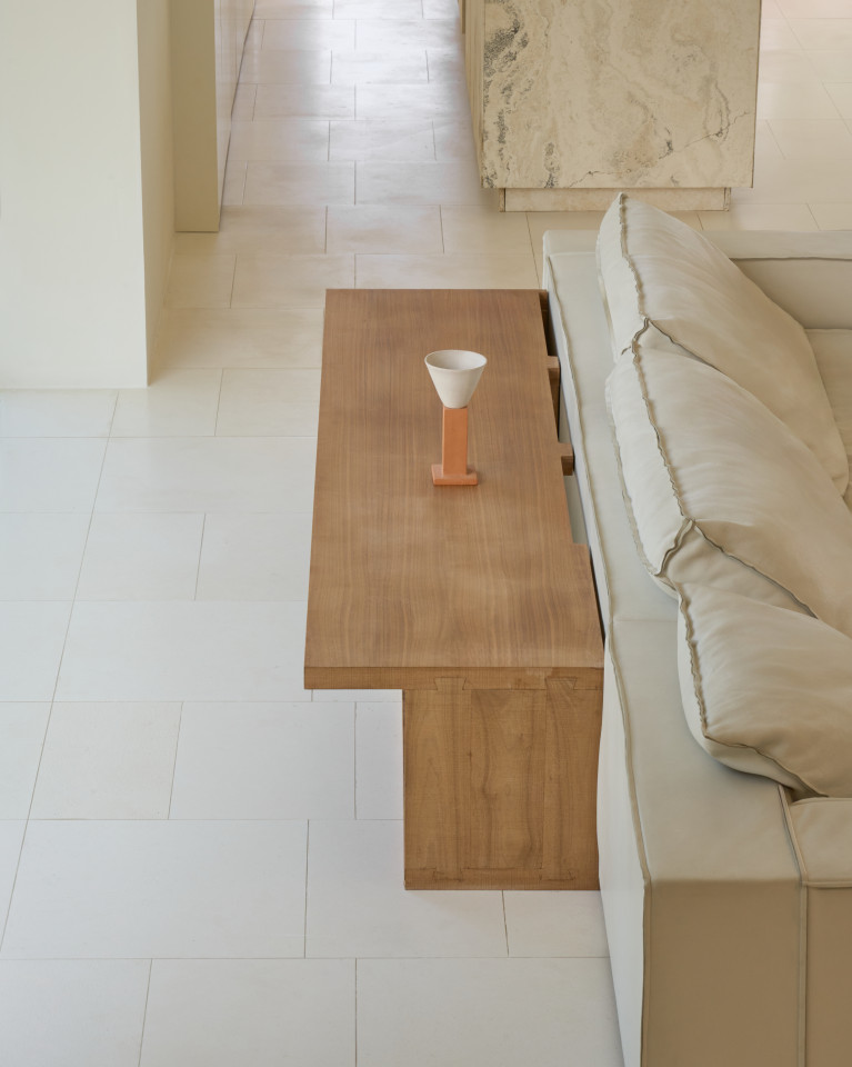 Die Architektur ist bewusst minimalistisch gehalten, so dass Licht und Schatten zu zentralen Elementen des Raumes werden. Hohe Decken mit freiliegenden Holzbalken und kalkverputzte Wände sorgen für eine warme, diffuse Lichtqualität während des Tages. Gewölbte Türöffnungen und geradlinige Durchgänge bieten klare Linien für die Einrahmung, während eingebaute Ecken und Bänke zum skulpturalen Charakter des Hauses beitragen.