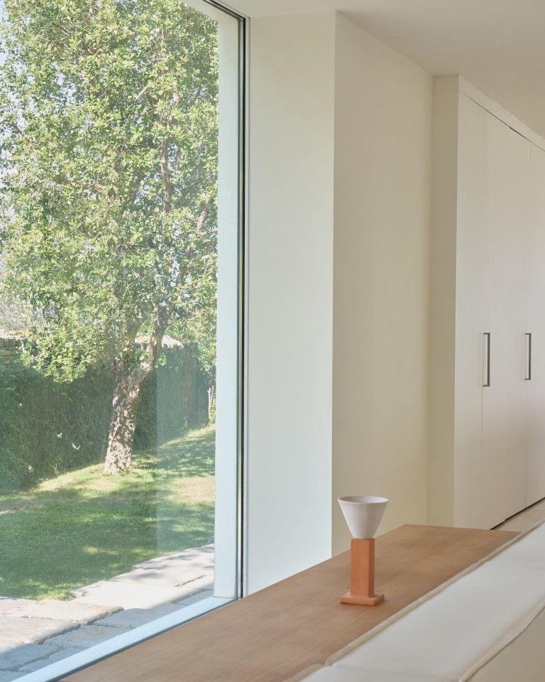 Die Außenarchitektur spiegelt die gleiche Zurückhaltung und Harmonie wider. Helle Fassaden verschmelzen mit dem ländlichen Horizont und werden durch weiche Holzfensterläden und zarte strukturelle Details unterbrochen. Die Außenbereiche - darunter Terrassen, schattige Sitzplätze und ein minimalistischer Poolbereich - erweitern die visuelle Sprache des Hauses und bieten eine Vielzahl von Umgebungen für Produktionsteams.
