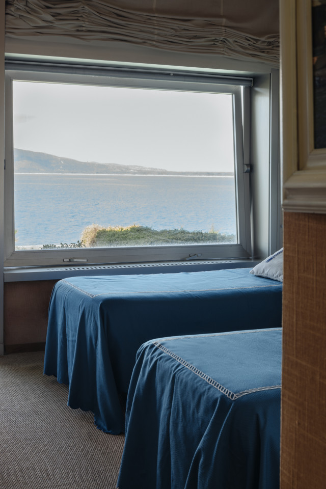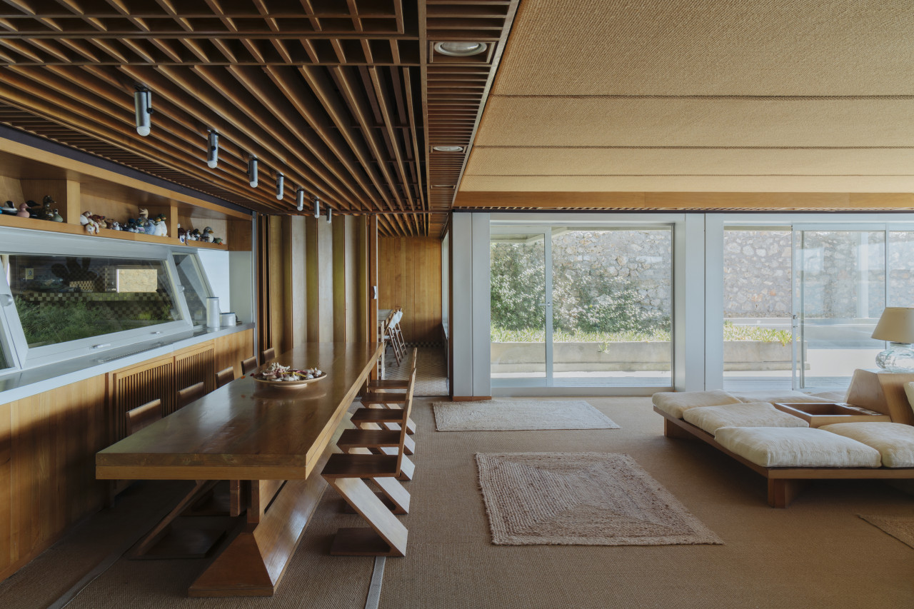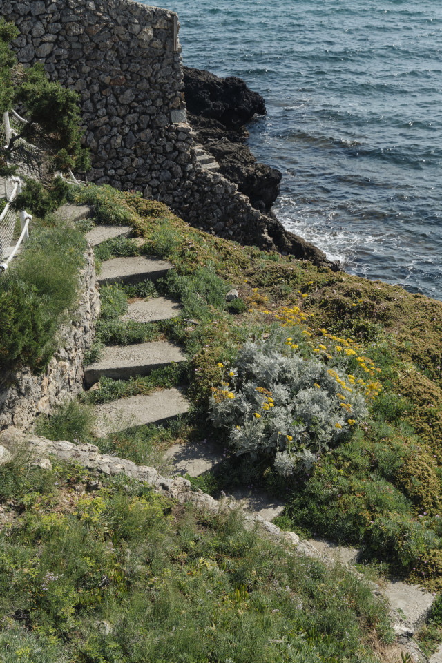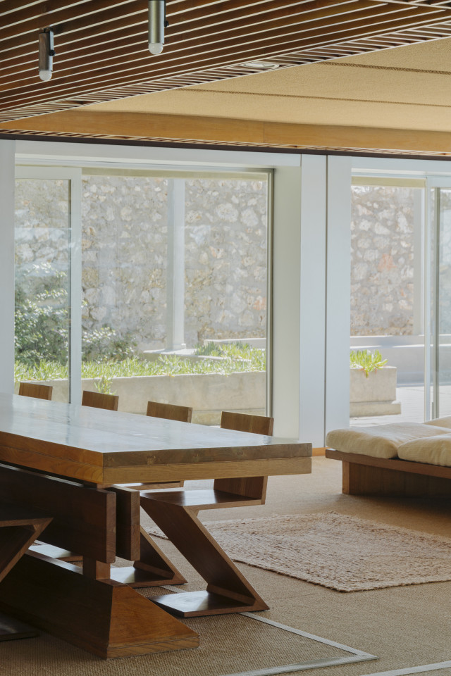 Die Innenräume sind wie Stillleben komponiert, mit eingebauten Steinbänken, gewölbten Decken und direkt in die Struktur gehauenen Treppen. Der Raum entfaltet sich in ruhigen Sequenzen und bietet einen erzählerischen Fluss von einem atmosphärischen Raum zum anderen. Gewölbte Nischen und flache Schwellen rahmen natürliche Ausblicke ein, während offene Kamine und rustikale Details das Haus in historischer Kontinuität erden.