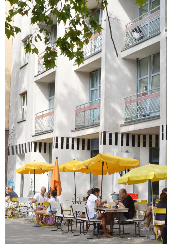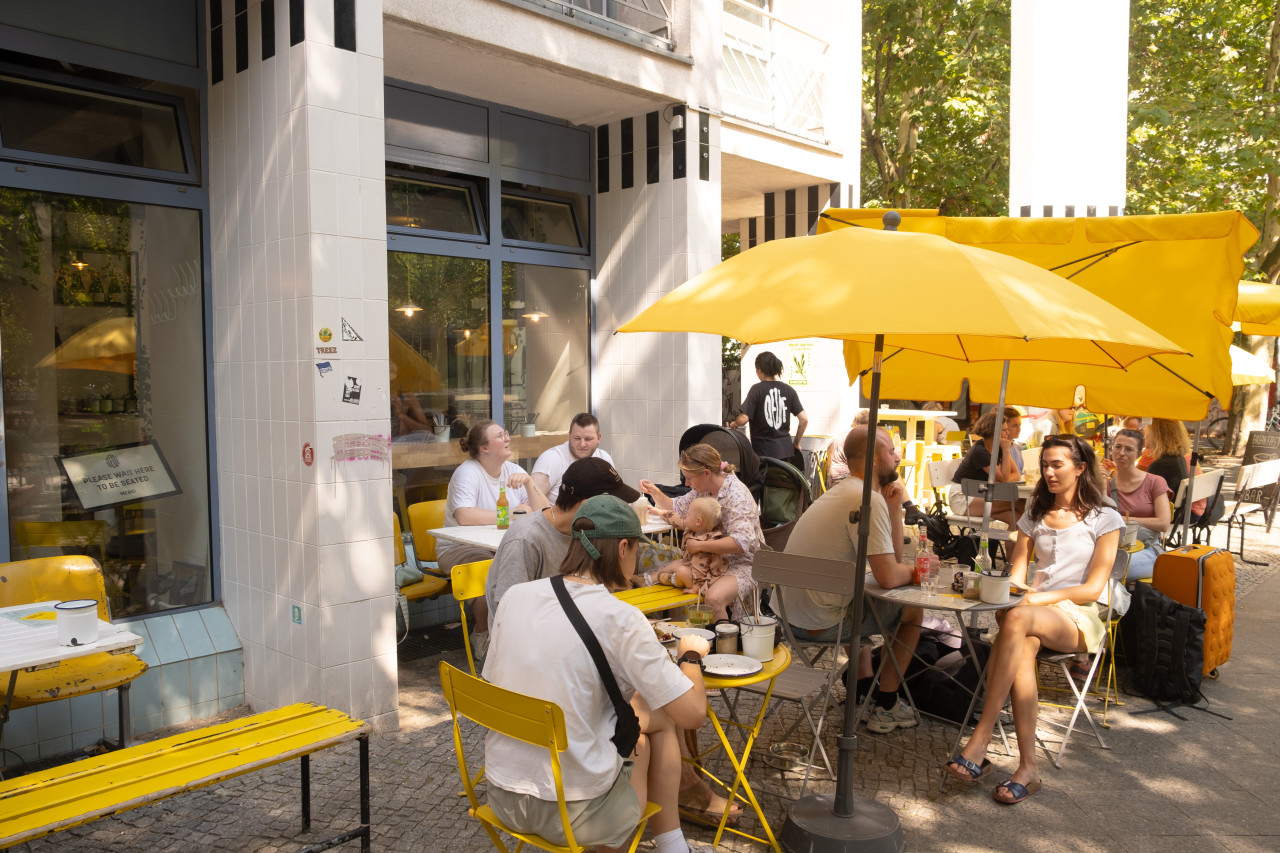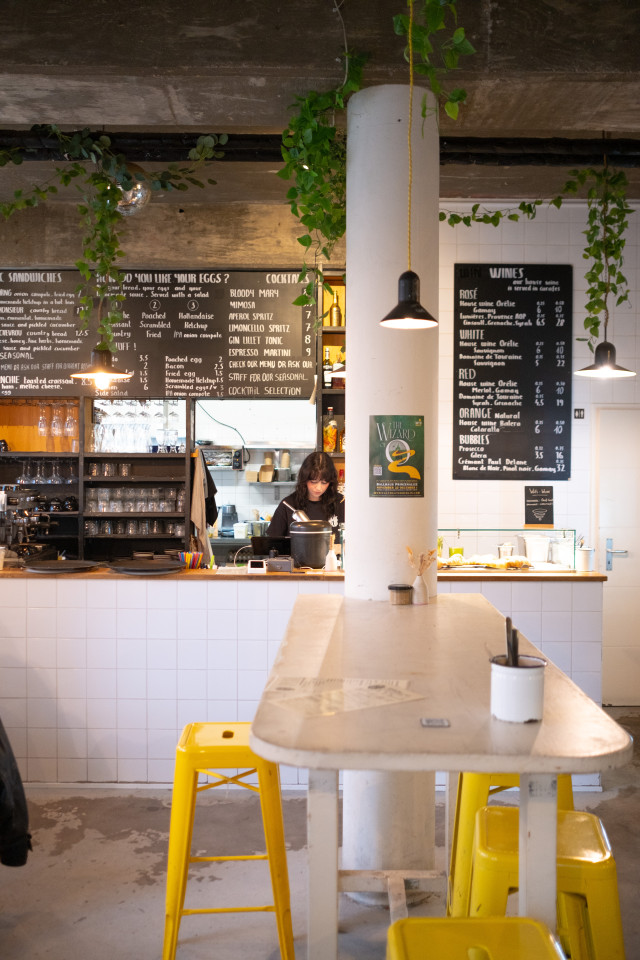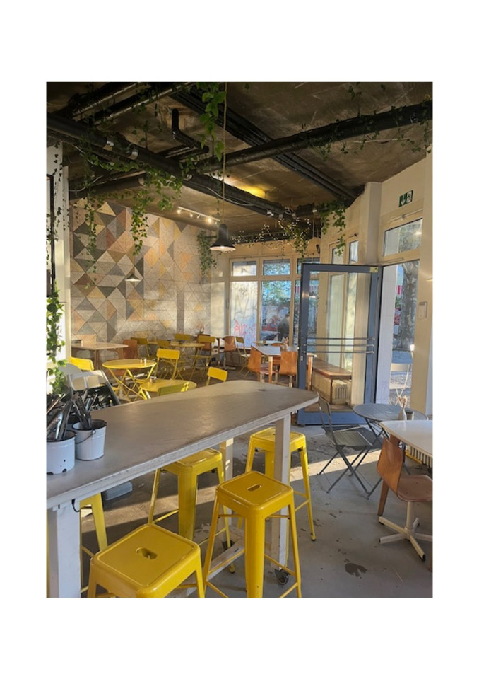 Ein helles, 80 Quadratmeter großes Café-Restaurant mit Vollverglasung und Blick auf einen belebten Platz mit Springbrunnen. Der von Tageslicht durchflutete Raum zeichnet sich durch eine rohe, industrielle Ästhetik mit Beton, Glas und Metall, hohen Decken mit freiliegenden Rohren und Kabeln und hängenden Pflanzen aus, die von oben herabhängen. Ein Ort mit ganz eigenem Charme.
