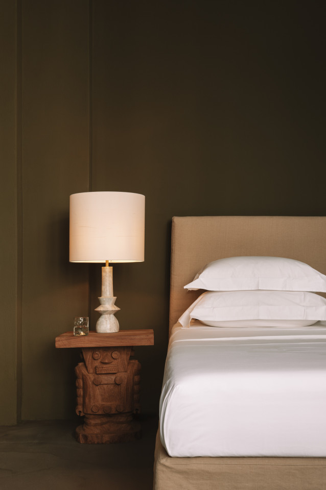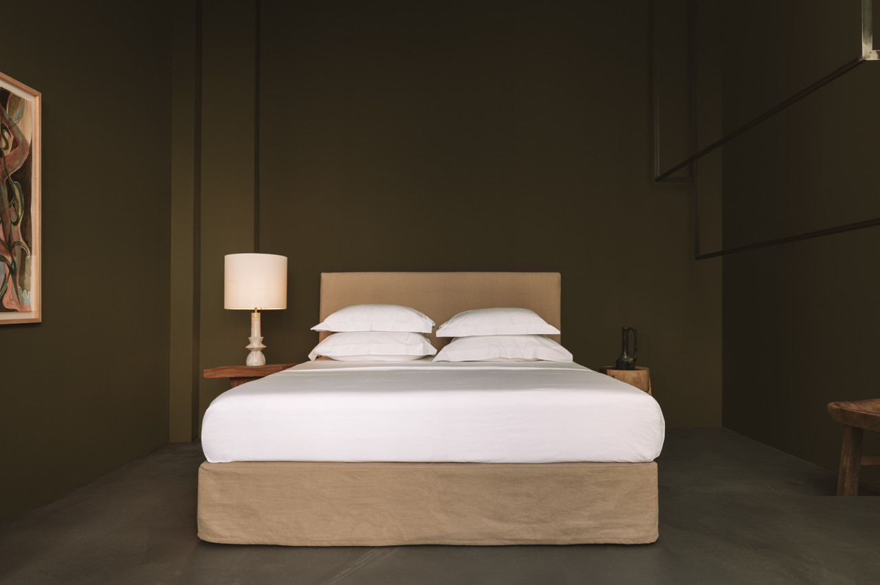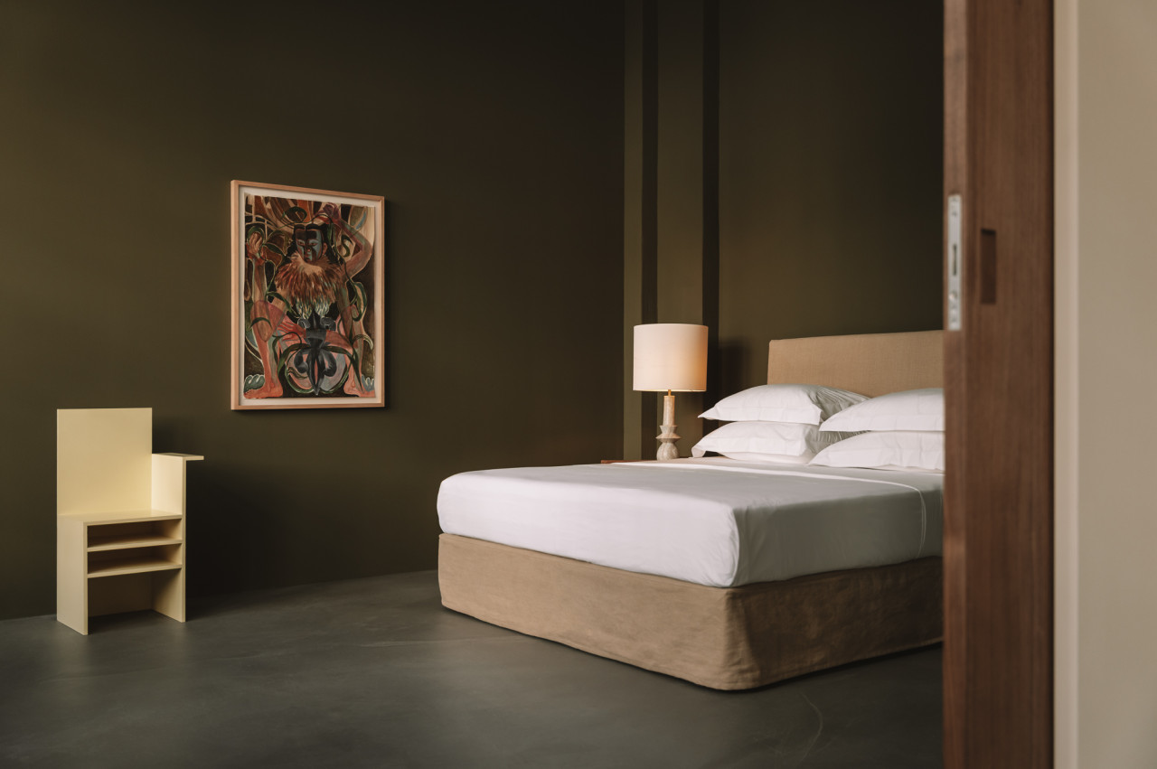 Mit seiner dunkelgrünen Farbgebung bildet das Schlafzimmer einen bewussten Kontrast zum hellen Wohnbereich und schafft eine ruhige, geschützte Atmosphäre im offenen Loft.