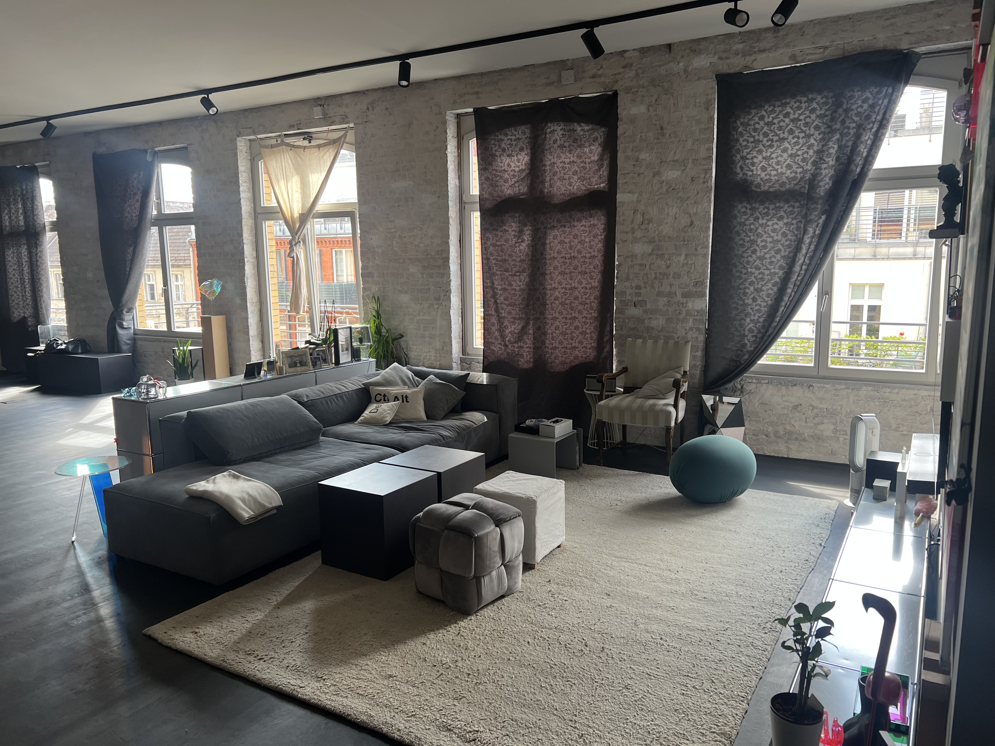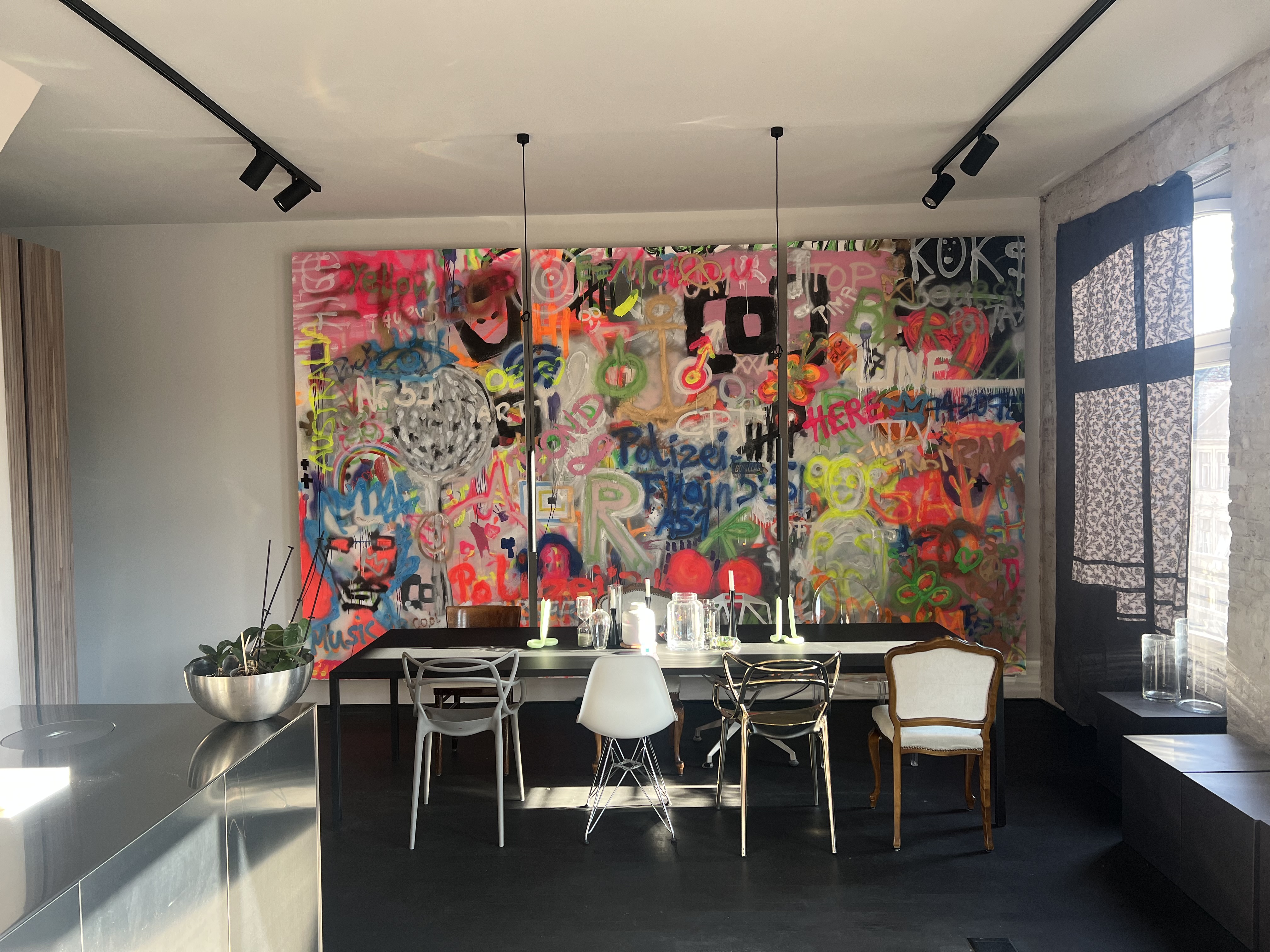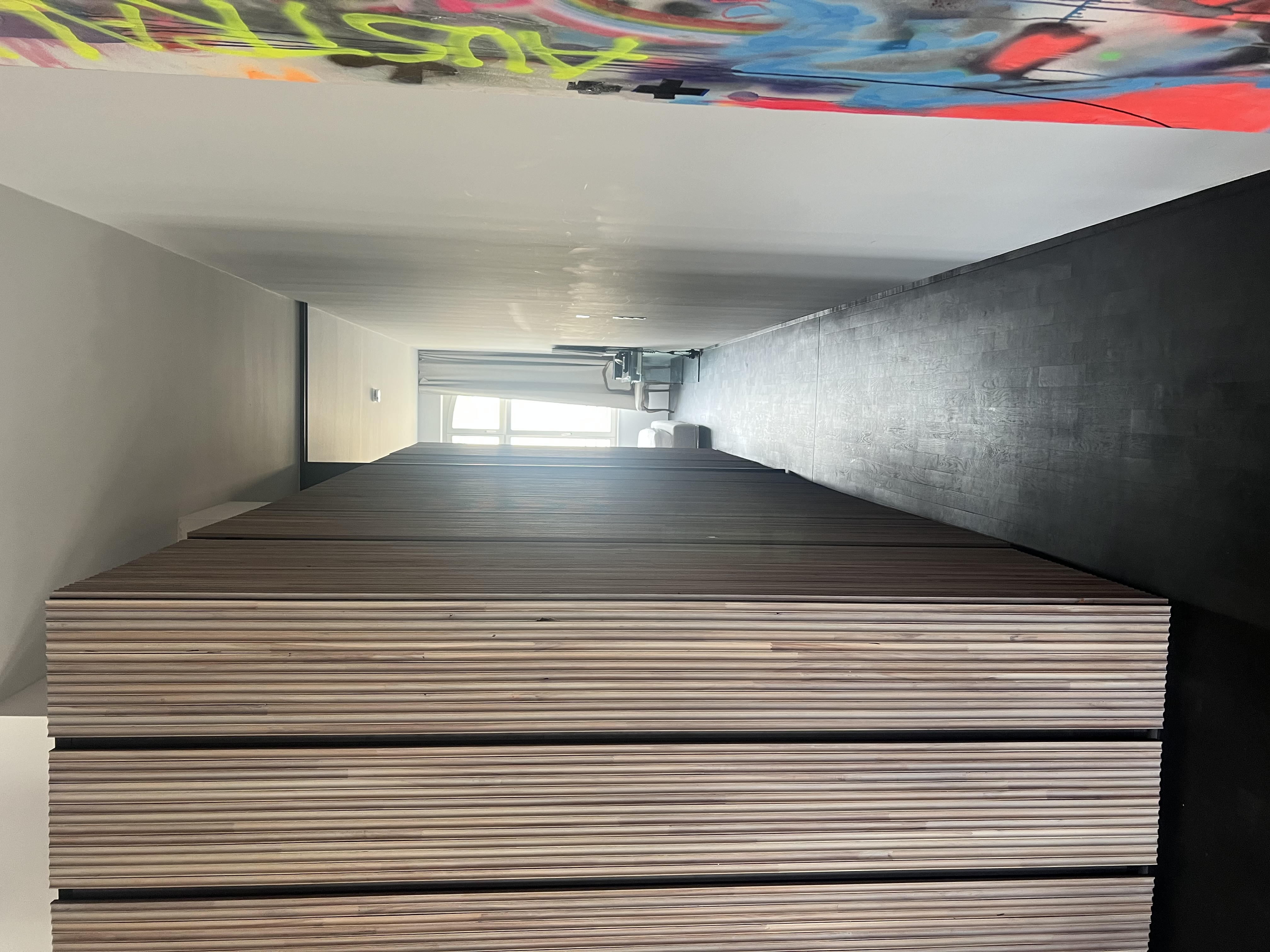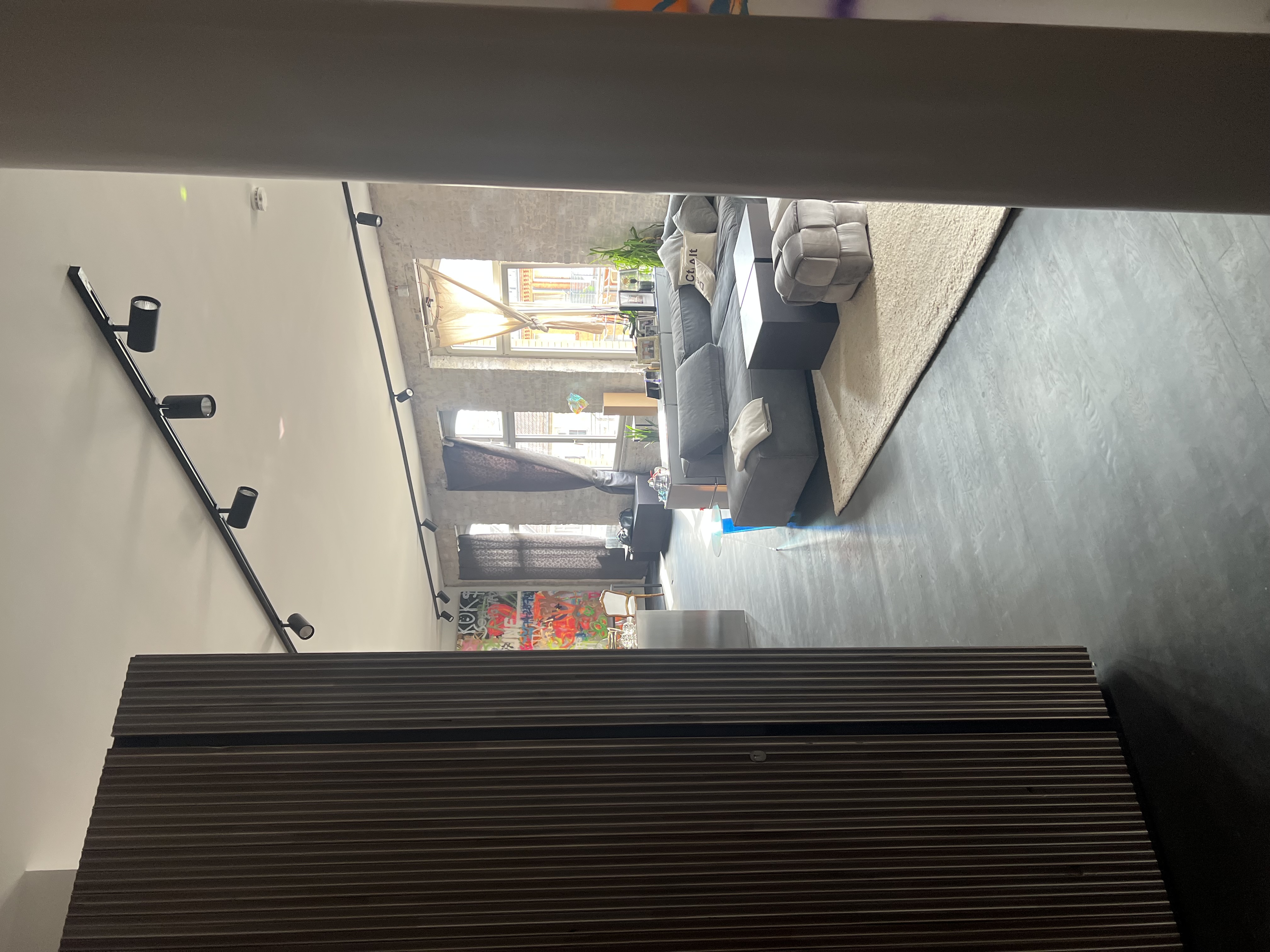 Entdecken Sie die Essenz des Stadtlebens in dieser modernen Loft-Wohnung, die von natürlichem Sonnenlicht durchflutet und von lebhaften Stadtpanoramen umgeben ist. Die Wohnung verfügt über eine Reihe gut ausgestatteter Räume, darunter eine Küche mit Holzschränken und einem auffälligen Metalltresen, der durch ein buntes Graffiti-Wandgemälde aufgewertet wird - perfekt für alle, die eine Mischung aus eklektischem Essen und modernem Design schätzen. Die Wohnbereiche sind offen und luftig, mit großen Fenstern, die das geschäftige Stadtbild einrahmen und eine friedliche und doch lebendige Wohnumgebung schaffen.