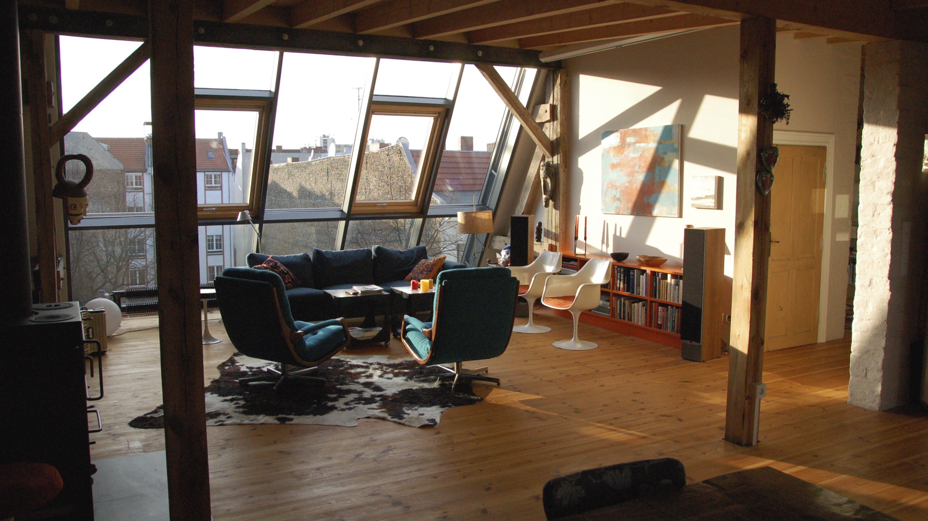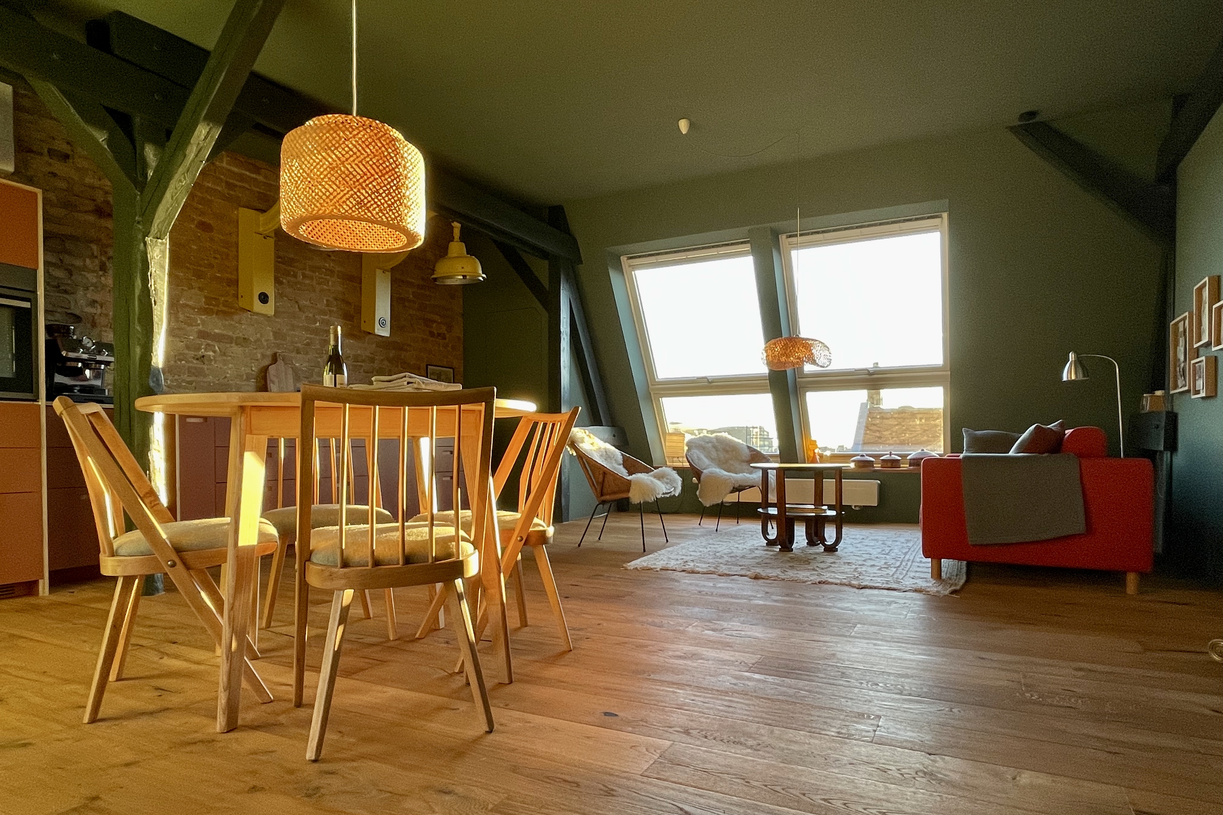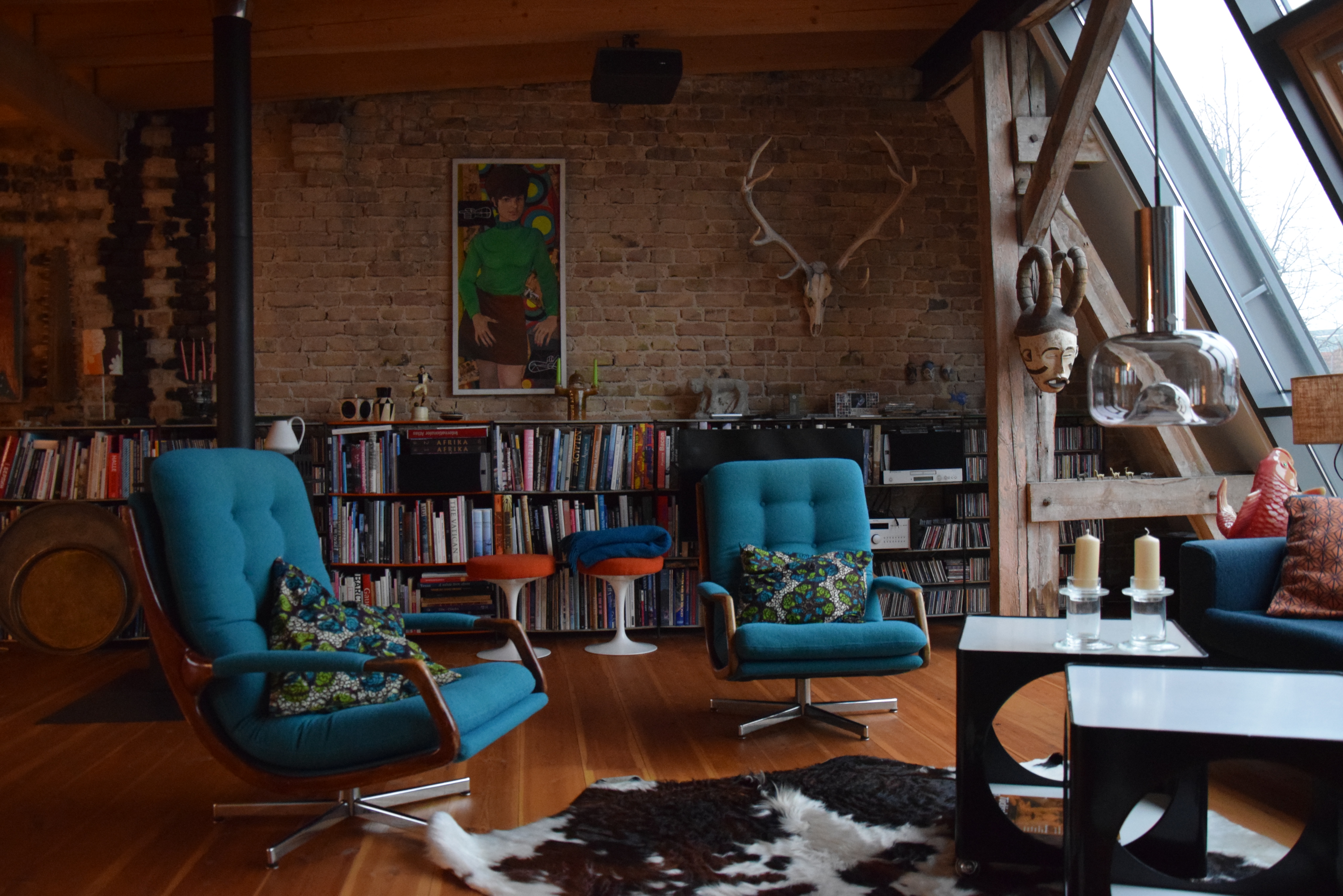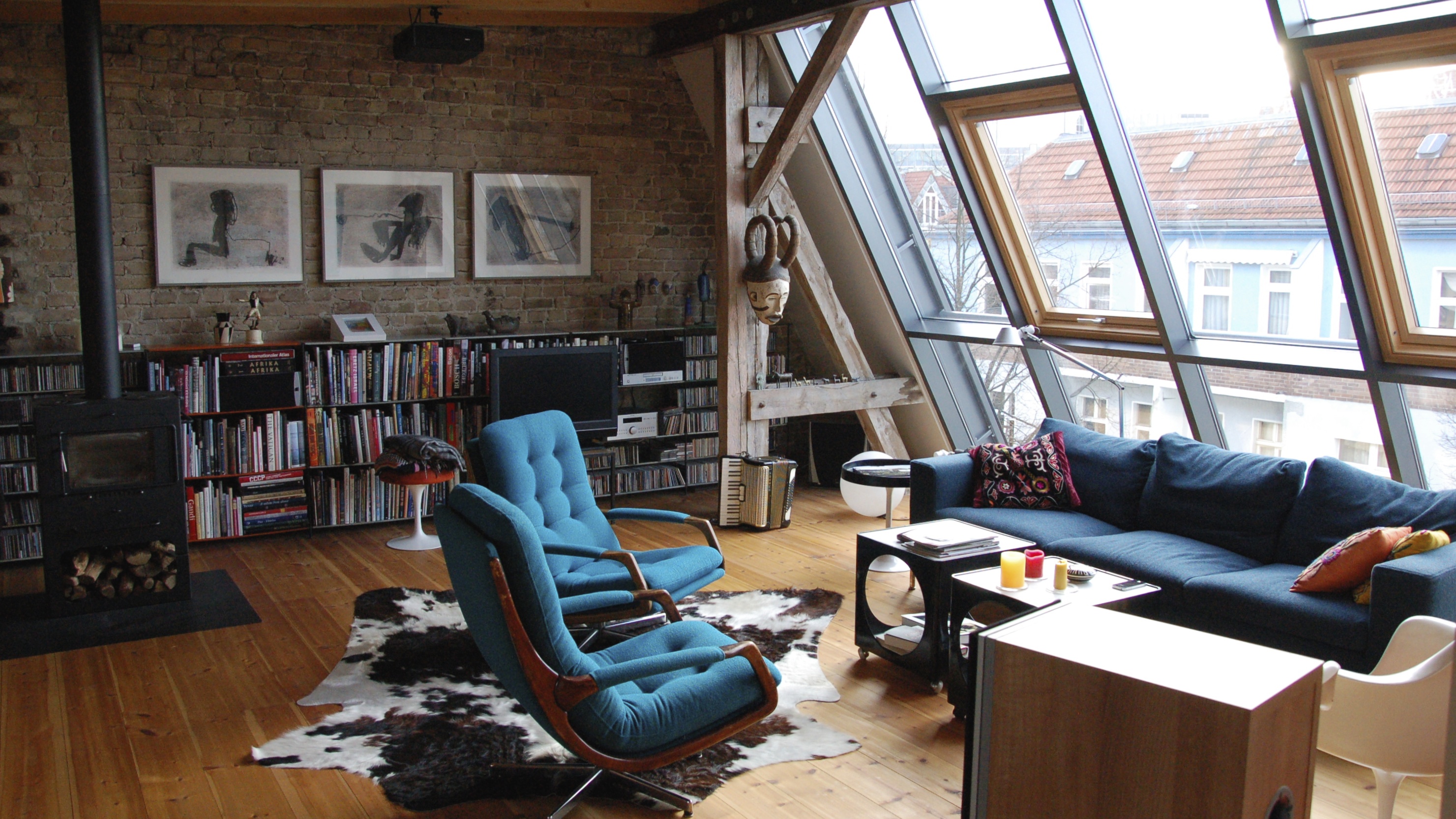 Erleben Sie den Inbegriff des urbanen Lebens in diesem exquisiten Loft, das den Reiz einer rustikalen, modernen Einrichtung mit der pulsierenden Energie des Stadtlebens verbindet. Dieses Loft verfügt über ein stilvolles Wohnzimmer mit blauen Möbeln, eklektischem Dekor und großen Fenstern, die den Raum mit natürlichem Licht durchfluten und eine warme und einladende Atmosphäre schaffen. Der Raum ist vielseitig und eignet sich mit seinen gemütlichen Sesseln und dem Kuhfellteppich sowohl zum Entspannen als auch zur Unterhaltung, die durch einen markanten Kamin und ein gut bestücktes Bücherregal unterstrichen wird.