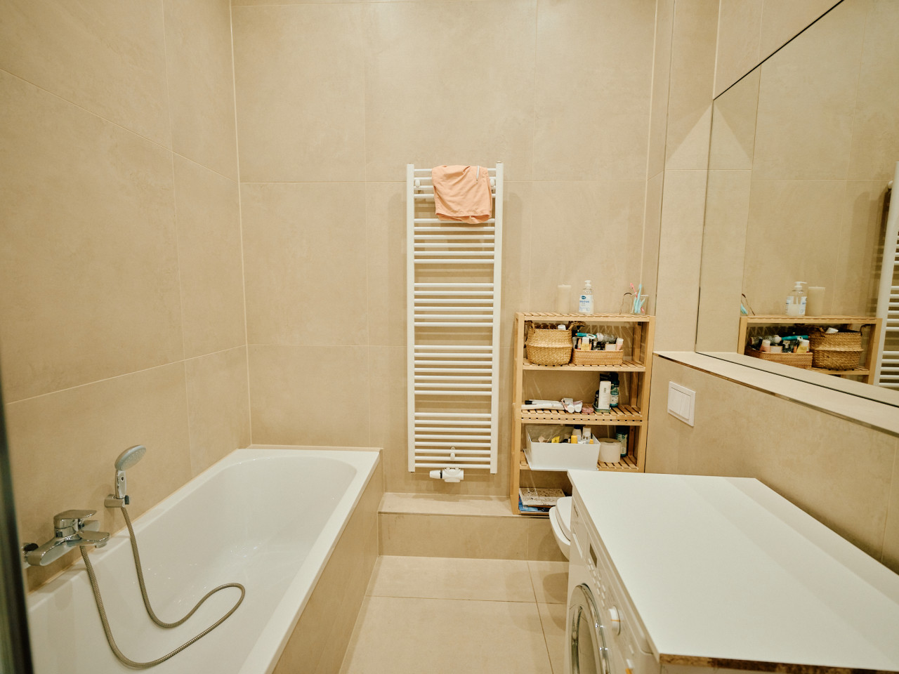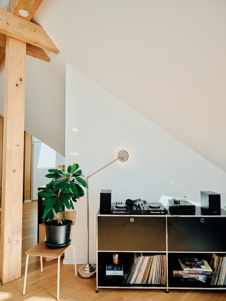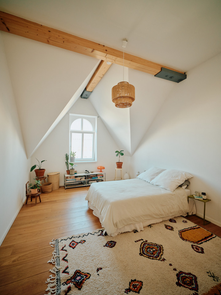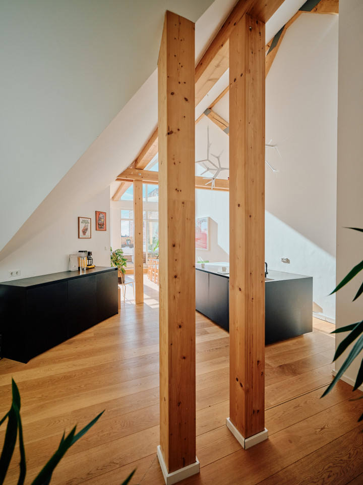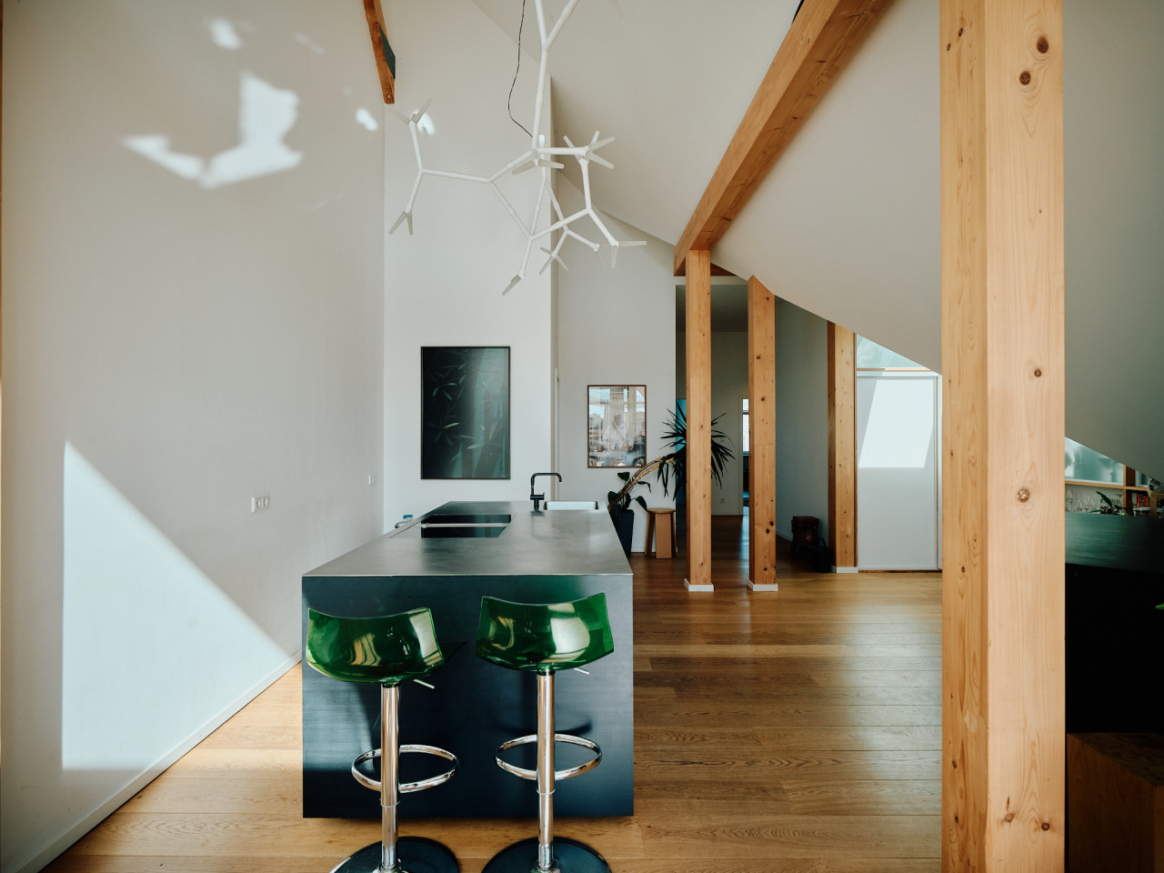 Rooftop Loft de diseño con más de 200 m2 de espacio habitable y 50m2 de terraza de madera con vistas a Berlín. Bora isla de cocina en el espacio de vida abierto, grandes polos de madera dentro de una estructura arquitectónica que fue construido en 2020. La altura del techo es de 7 metros. La luz del sol desde primera hora de la mañana hasta última hora de la tarde inunda a través de la estructura de ventanas triangulares. Tres habitaciones, dos baños con diferentes miradas, estructura de madera moderna continúa.
