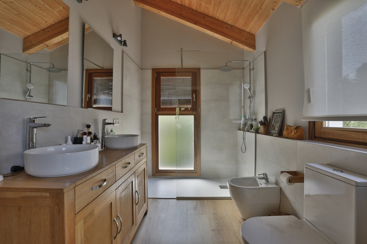 Cada dormitorio mantiene la paleta suave y natural de la casa, con cálidos tonos de madera, techos altos y un equilibrio de sencillez y encanto. Los toques personales, como las obras de arte enmarcadas, los delicados tejidos y los accesorios artesanales, aportan carácter a la vez que mantienen una estética limpia y lista para el rodaje. Los cuartos de baño son amplios y modernos, con elegantes accesorios, armarios de madera y acabados tipo spa que complementan la relajante atmósfera de la casa.