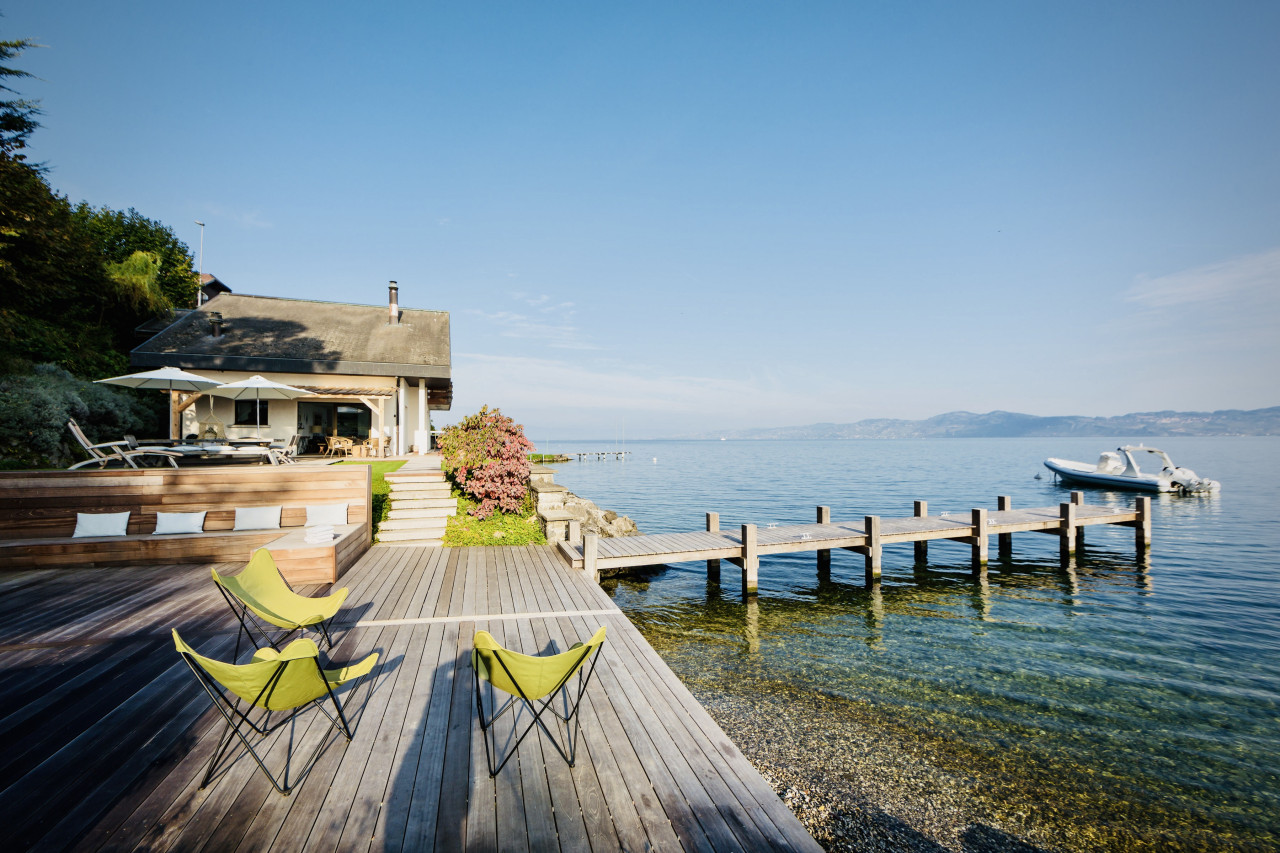 Situada en la tranquila orilla del lago Lemán, esta impresionante casa junto al lago ofrece una fusión perfecta de diseño náutico de mediados de siglo y minimalismo alpino. Ideal para estilo de vida, moda, interiores, producciones cinematográficas y eventos privados, la propiedad combina nítidas líneas arquitectónicas con elementos retro costeros y vistas panorámicas al lago. El salón-comedor de planta abierta cuenta con una llamativa chimenea colgante, muebles de madera hechos a mano y cristaleras que se abren a un embarcadero privado y a una amplia terraza ajardinada, perfecta para hacer fotografías cinematográficas a ras de agua. Dispone de muelle y playa privados con acceso directo al lago.