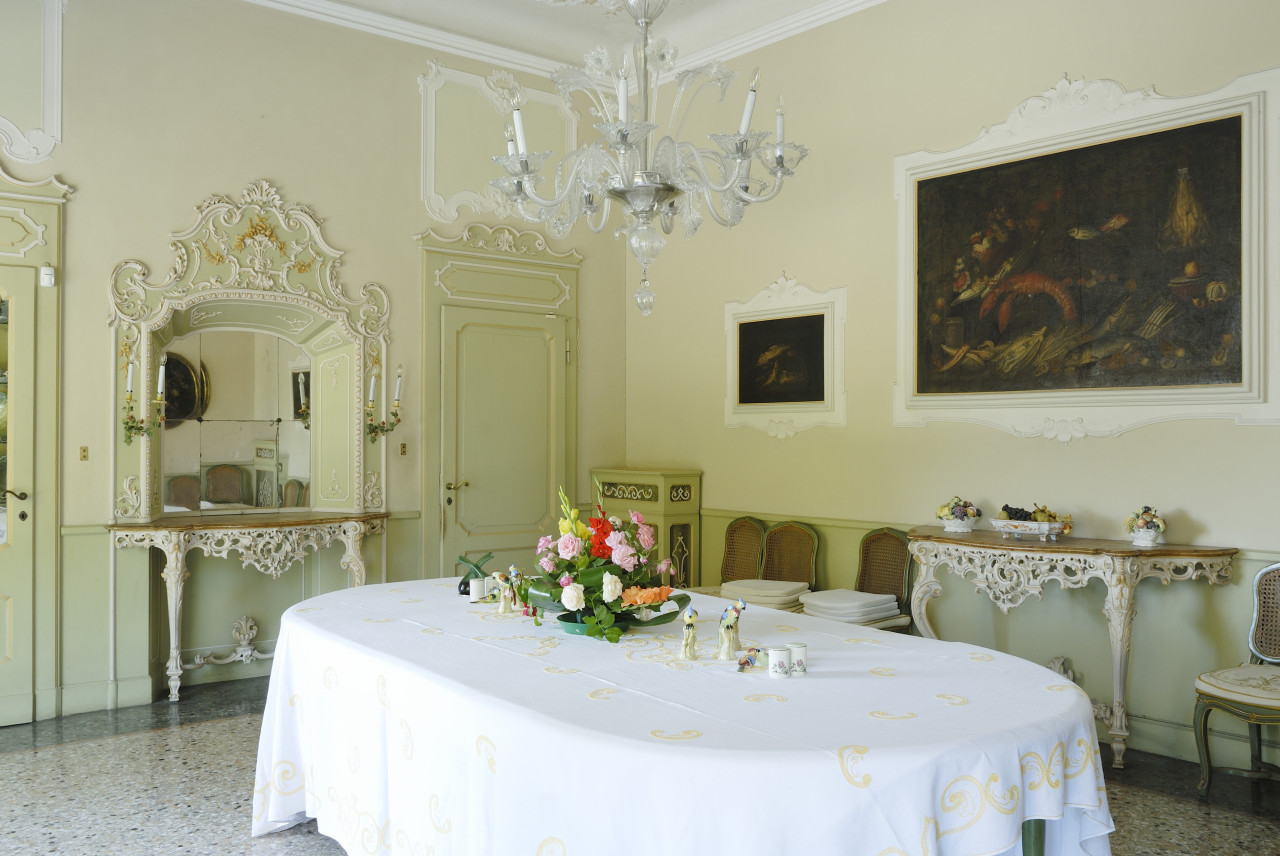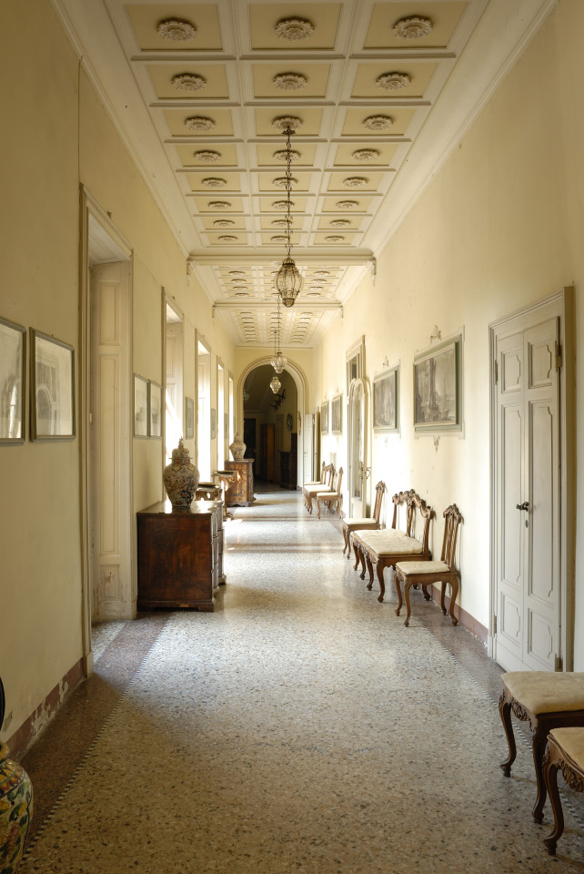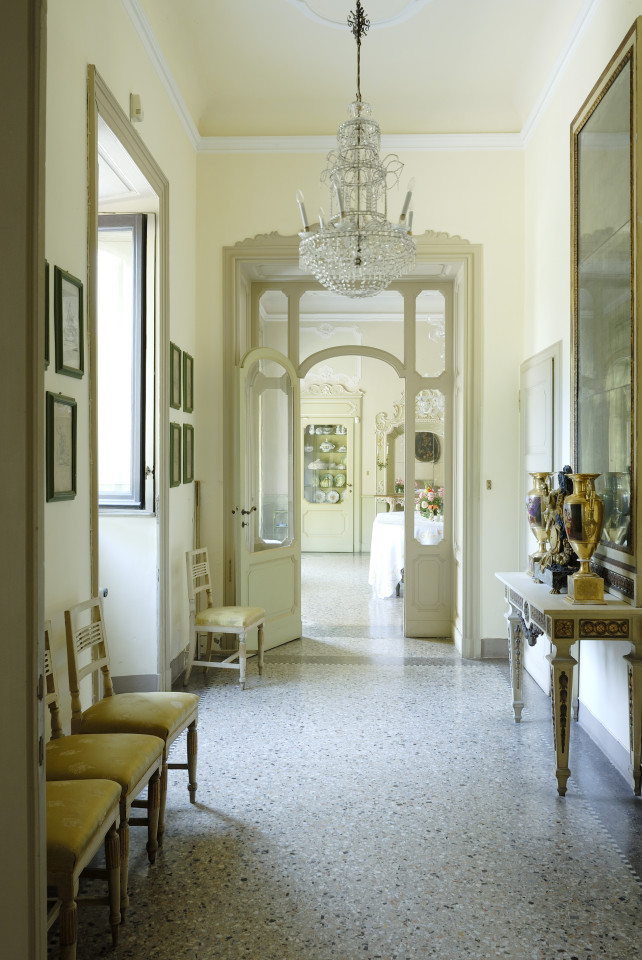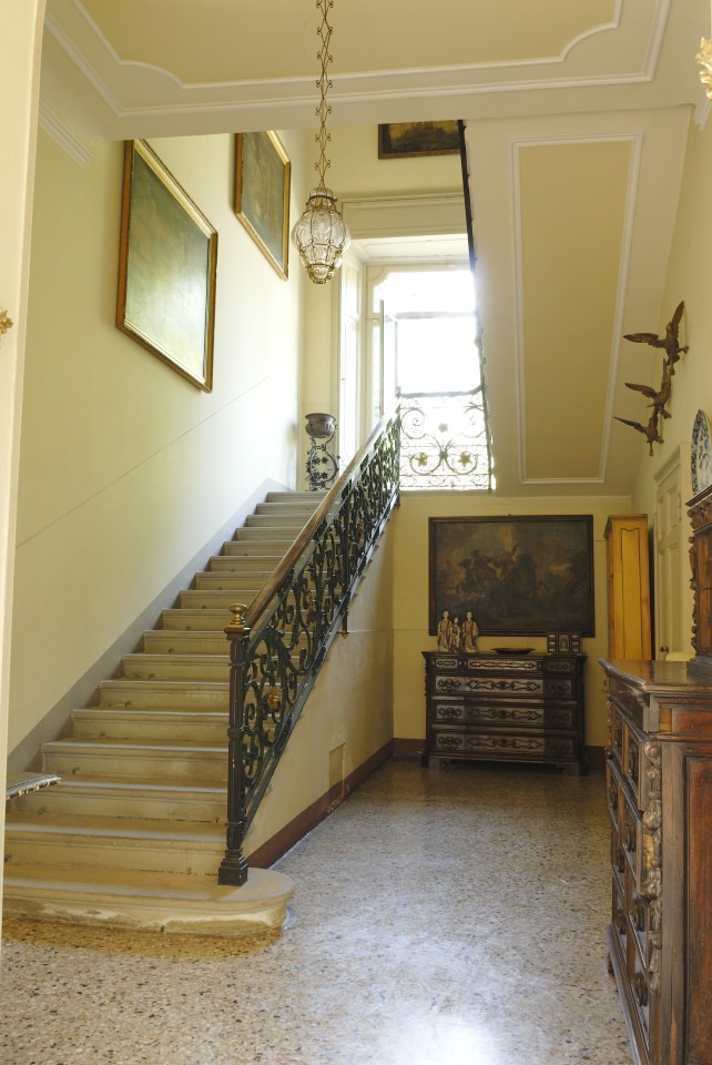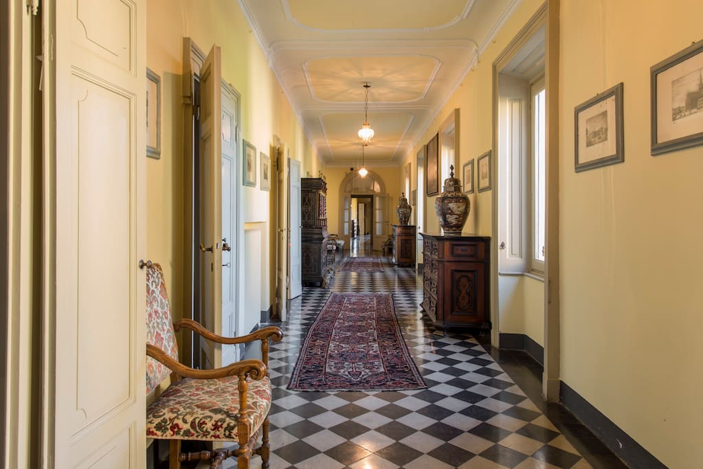 Al entrar en la villa, se le da la bienvenida a un mundo de interiores luminosos y patrimonio artístico. Los altos techos están adornados con detalles originales de estuco y frescos pintados a mano, creando un ambiente majestuoso. Los amplios salones y las íntimas salas de estar están llenos de luz natural que fluye a través de altas ventanas arqueadas, resaltando los suelos de madera pulida, los muebles antiguos y los espejos dorados. Las sillas tapizadas en terciopelo y las majestuosas arañas de cristal añaden sofisticación y calidez, capturando la esencia del lujo italiano.