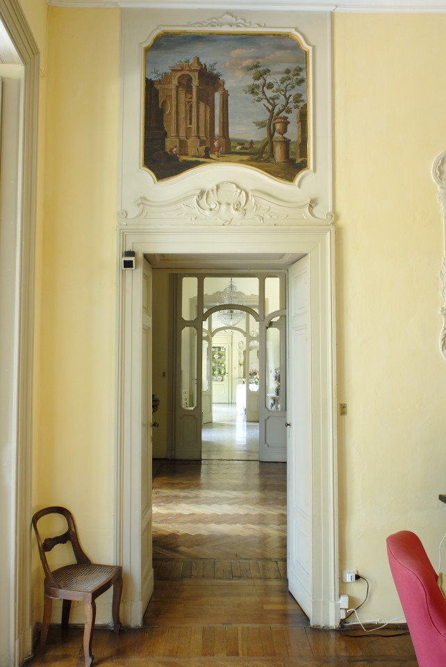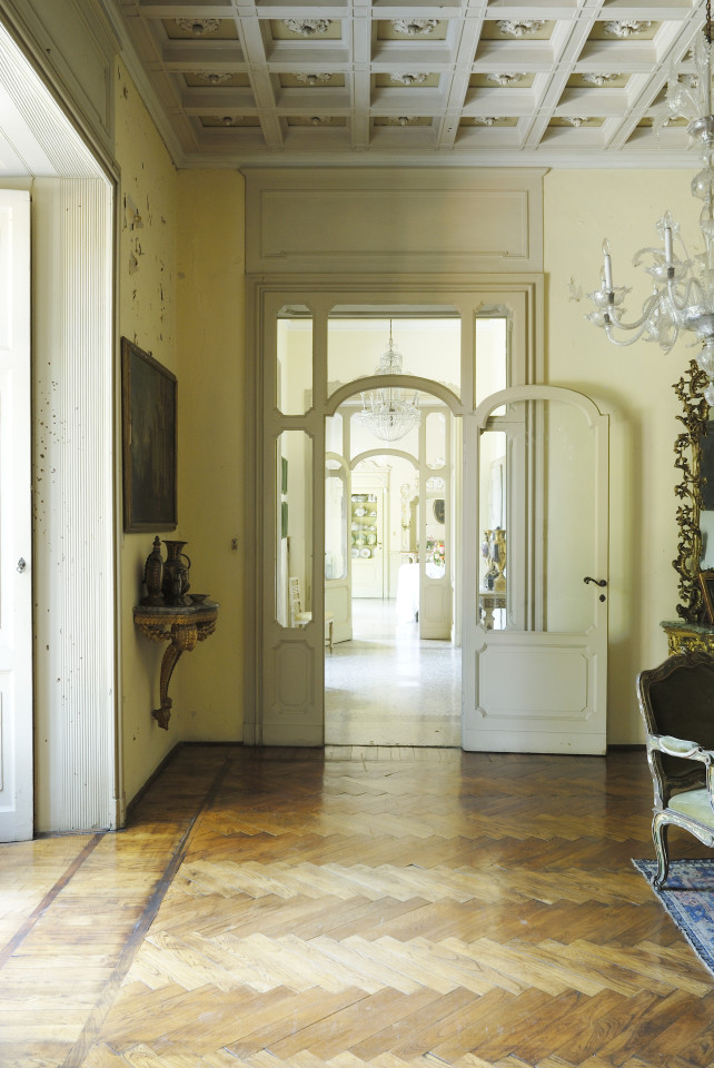 Los espacios están conectados por sorprendentes pasillos y escaleras de mármol en damero, enmarcados por ornamentadas barandillas de hierro forjado e iluminados por candelabros en cascada. Cada pasillo ofrece un viaje visual a través de auténticos detalles arquitectónicos, como medallones decorativos de escayola, puertas arqueadas y obras de arte que realzan la historia de la villa.