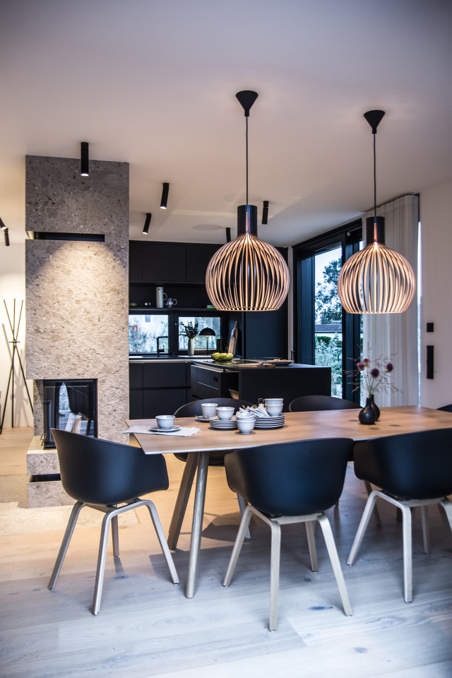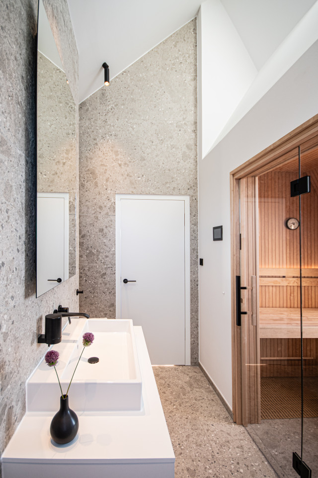 La espaciosa entrada se extiende en dos plantas y está inundada de luz gracias a grandes ventanales en la parte delantera y trasera, así como a un sistema de claraboyas. La primera planta alberga la cocina abierta y el salón con chimenea como zona común y de comunicación. Grandes elementos correderos de cristal a las terrazas conectan el interior y el exterior y dan la sensación de estar sentado en las dunas junto al mar. Numerosas zonas de retiro se distribuyen en tres plantas, de modo que la paz, la intimidad y la relajación están garantizadas para todos los huéspedes en cualquier época del año.