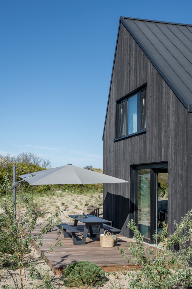 Esta casa única está situada muy cerca de la playa, apoyada directamente contra las dunas con su estructura asimétrica orientada hacia el viento del oeste. La arquitectura se caracteriza por un tejado de zinc negro y ventanas de madera negra, equilibrando un interior cálido y acogedor con su moderno exterior.