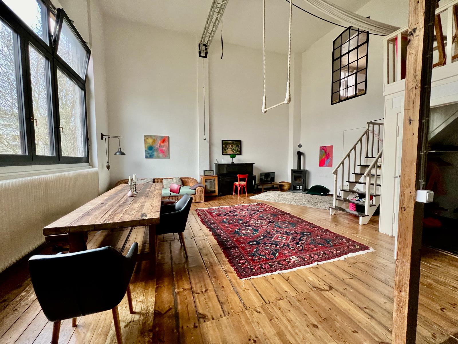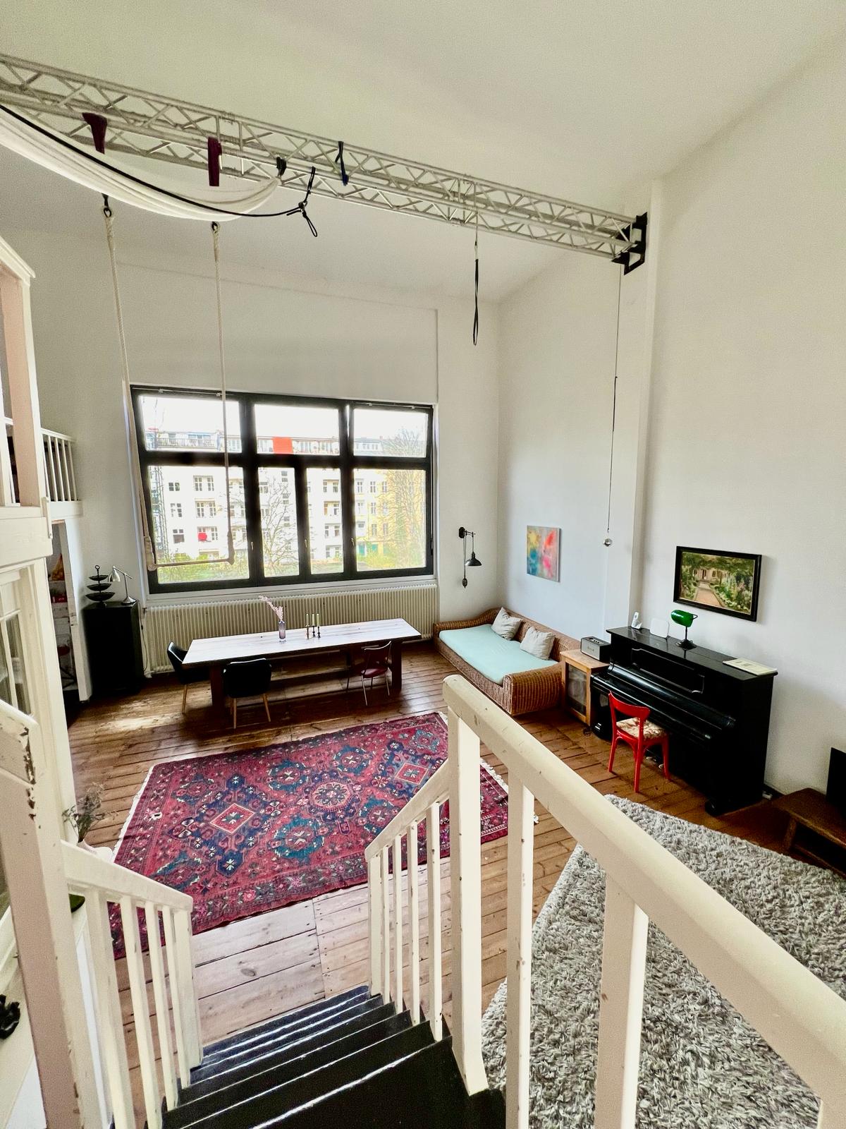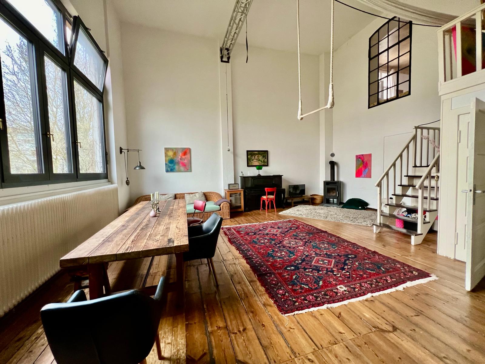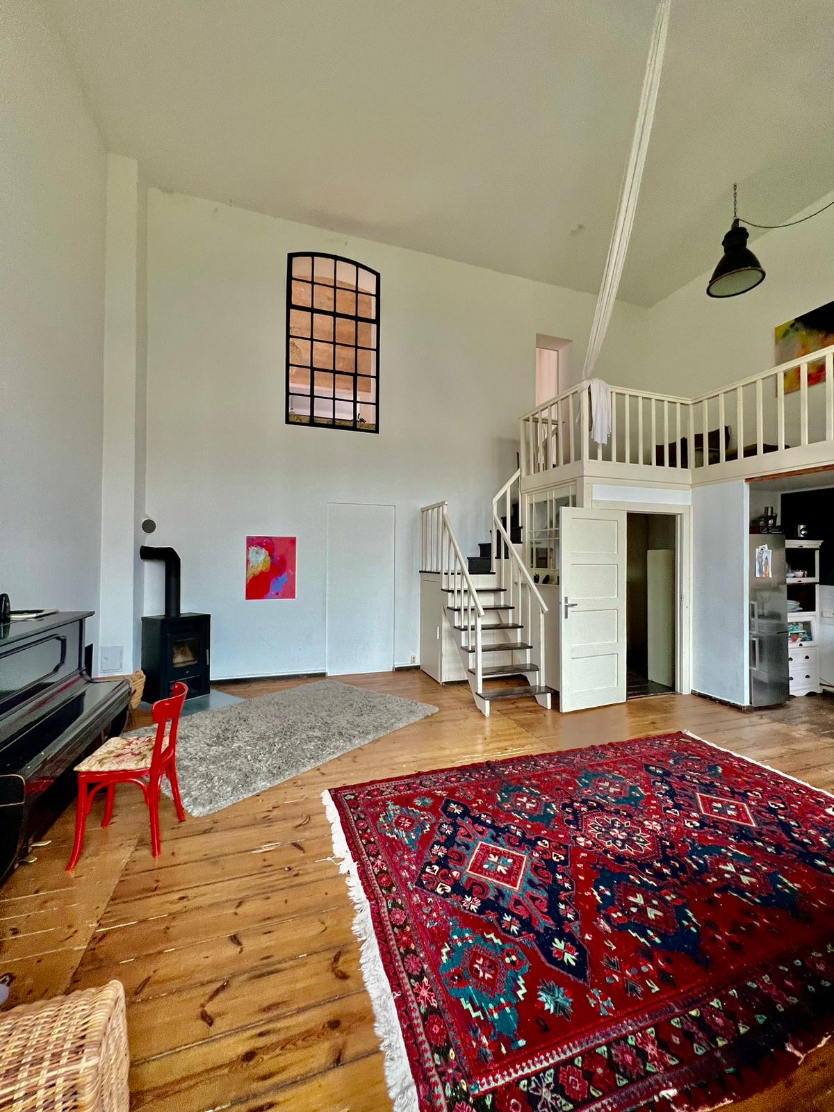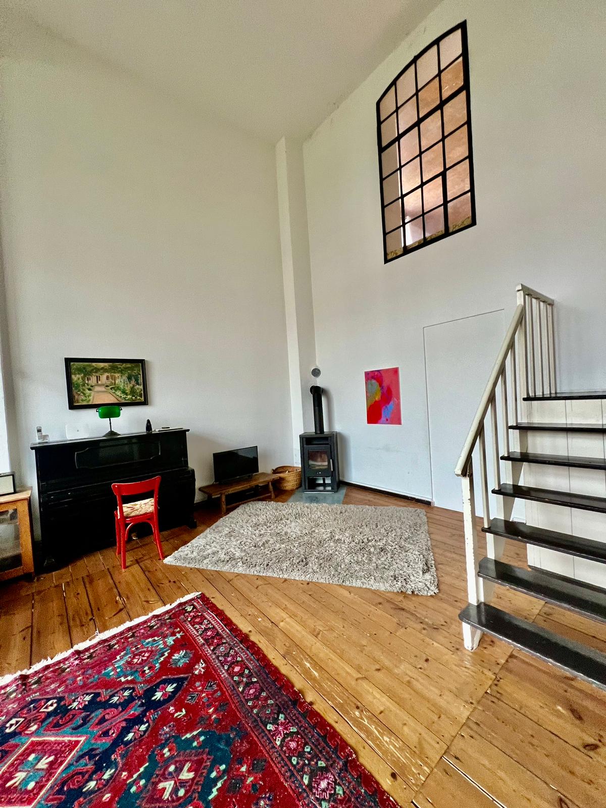 Experimente una vibrante mezcla de confort moderno y estilo artístico en este espacioso loft. El corazón del apartamento cuenta con suelos de madera y grandes ventanales que bañan el espacio de luz natural, enfatizando la decoración ecléctica que incluye un llamativo sofá amarillo, un piano de cola y una exuberante alfombra roja. Ideal para entretenerse y relajarse, el salón se funde a la perfección con una cocina minimalista equipada con elegantes electrodomésticos y elementos rústicos, creando un refugio urbano perfecto.