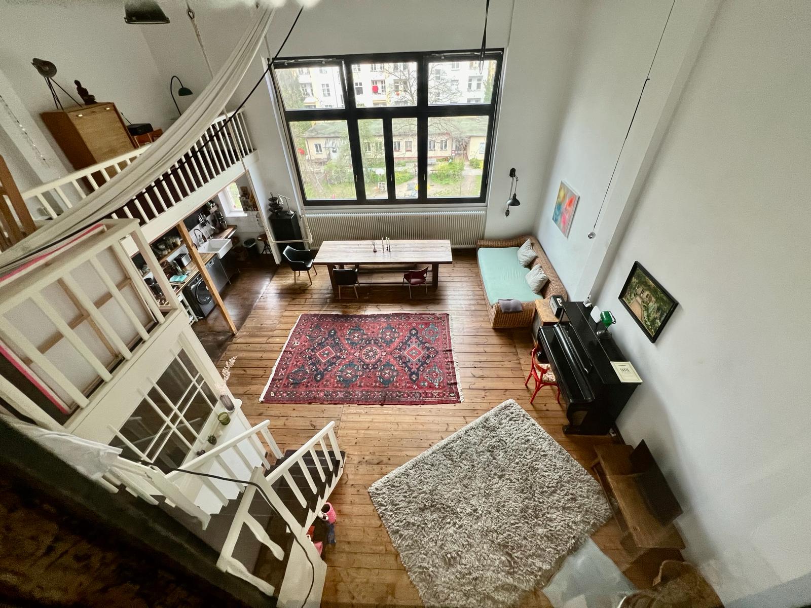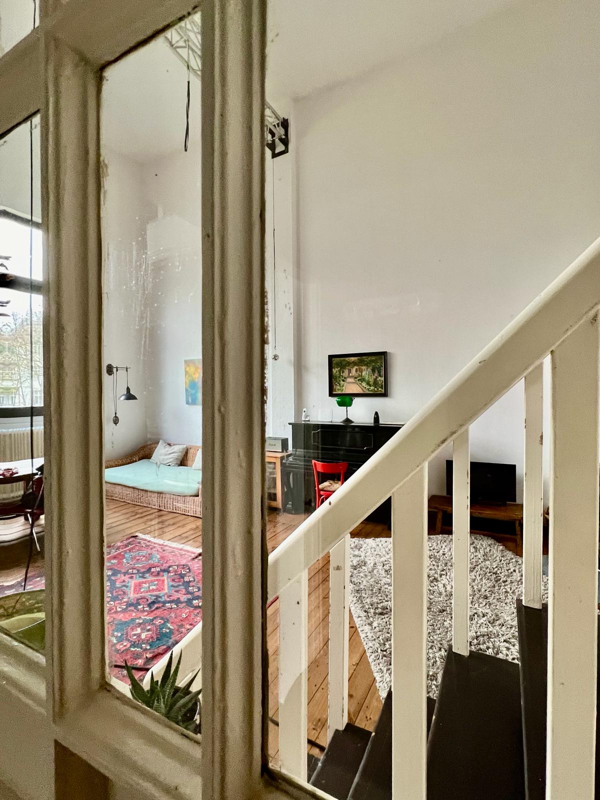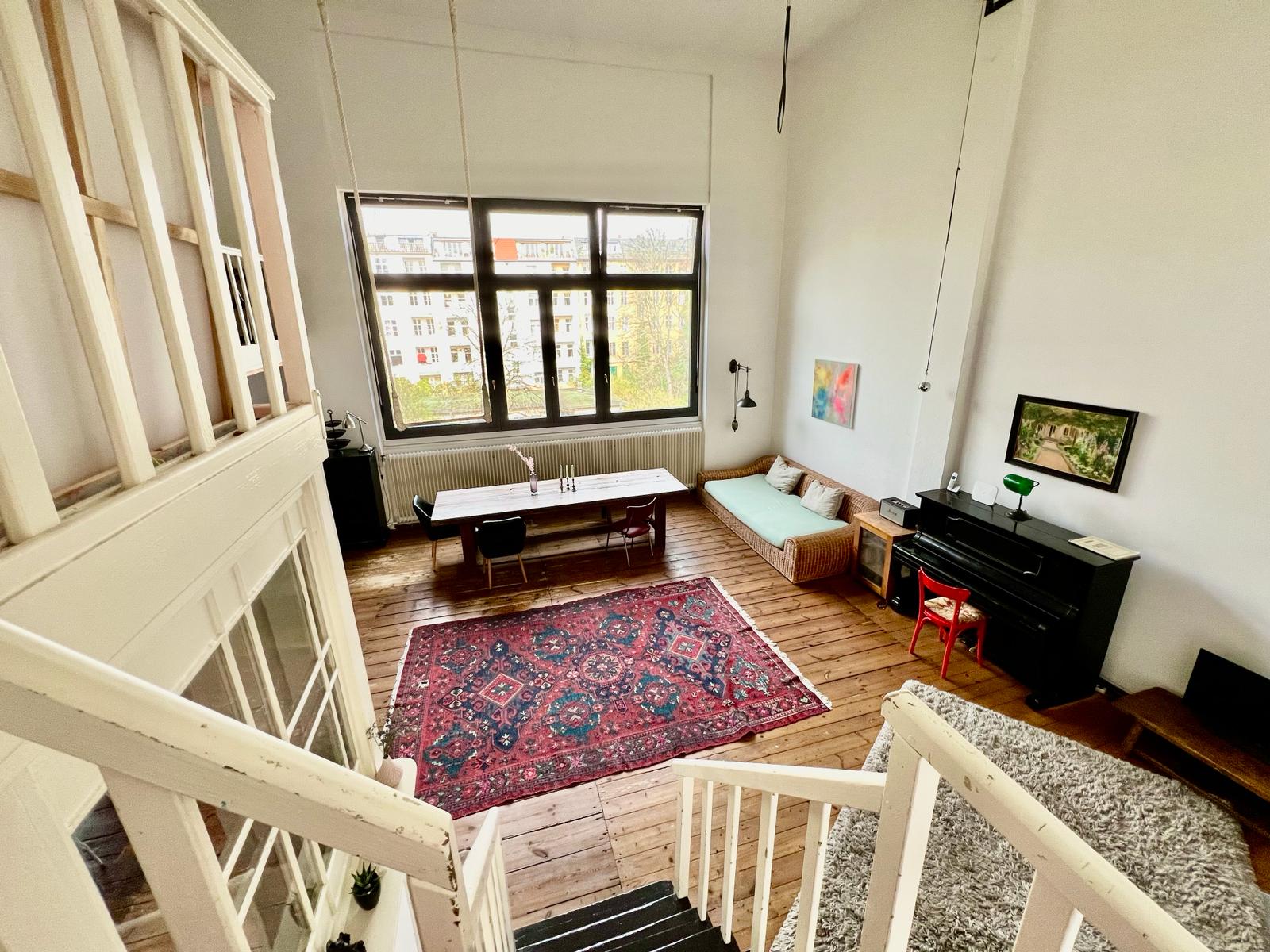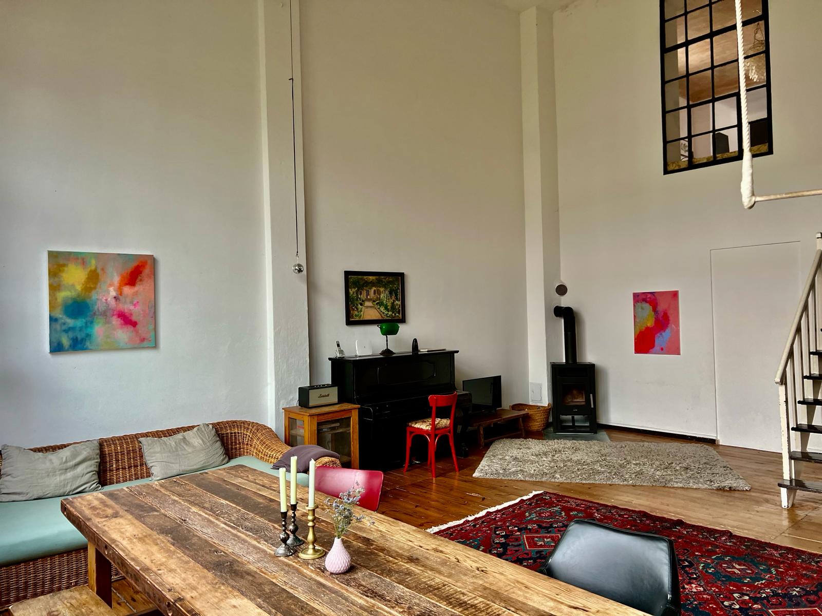 Experimente una vibrante mezcla de confort moderno y estilo artístico en este espacioso loft. El corazón del apartamento cuenta con suelos de madera y grandes ventanales que bañan el espacio de luz natural, enfatizando la decoración ecléctica que incluye un llamativo sofá amarillo, un piano de cola y una exuberante alfombra roja. Ideal para entretenerse y relajarse, el salón se funde a la perfección con una cocina minimalista equipada con elegantes electrodomésticos y elementos rústicos, creando un refugio urbano perfecto.