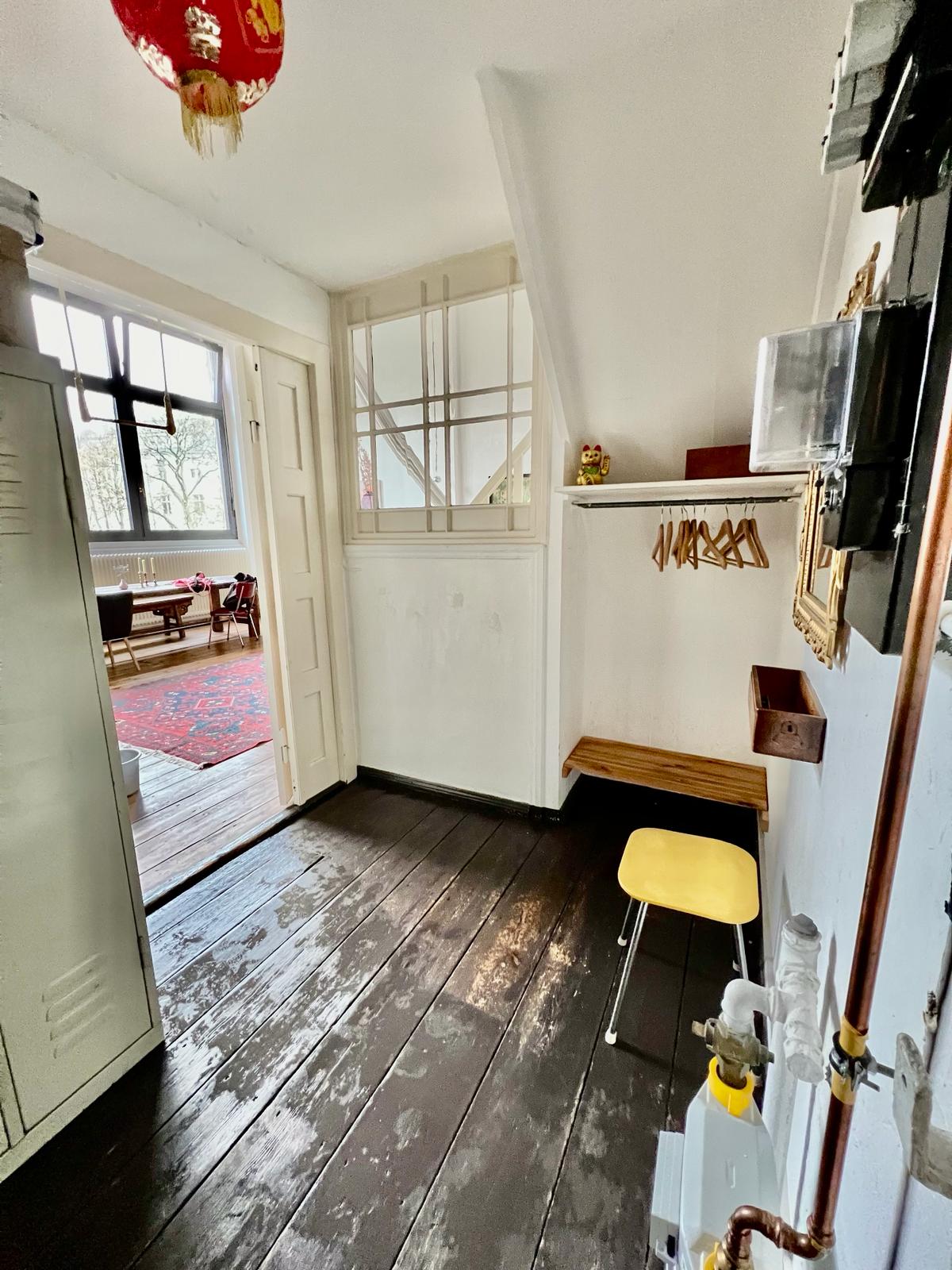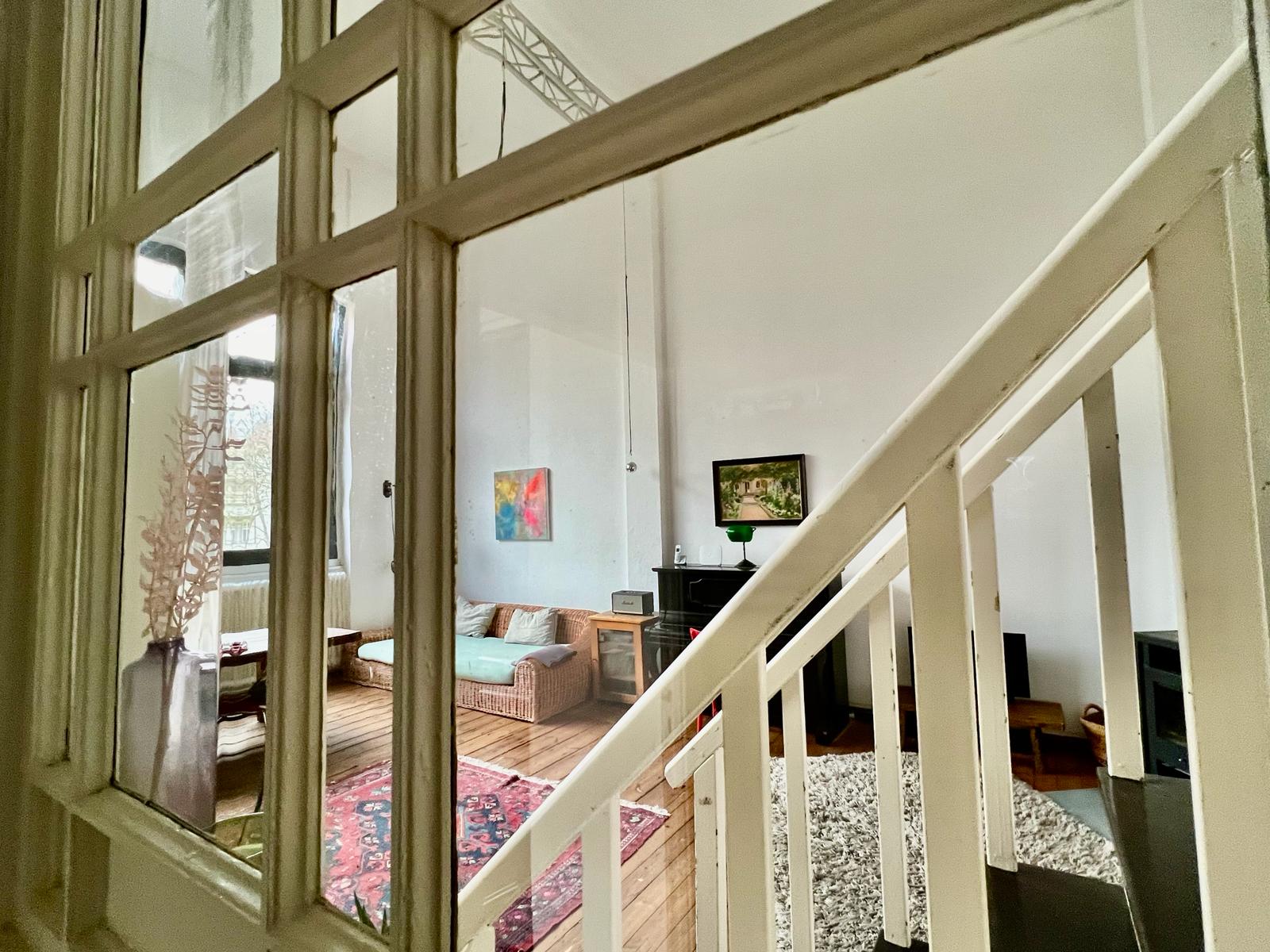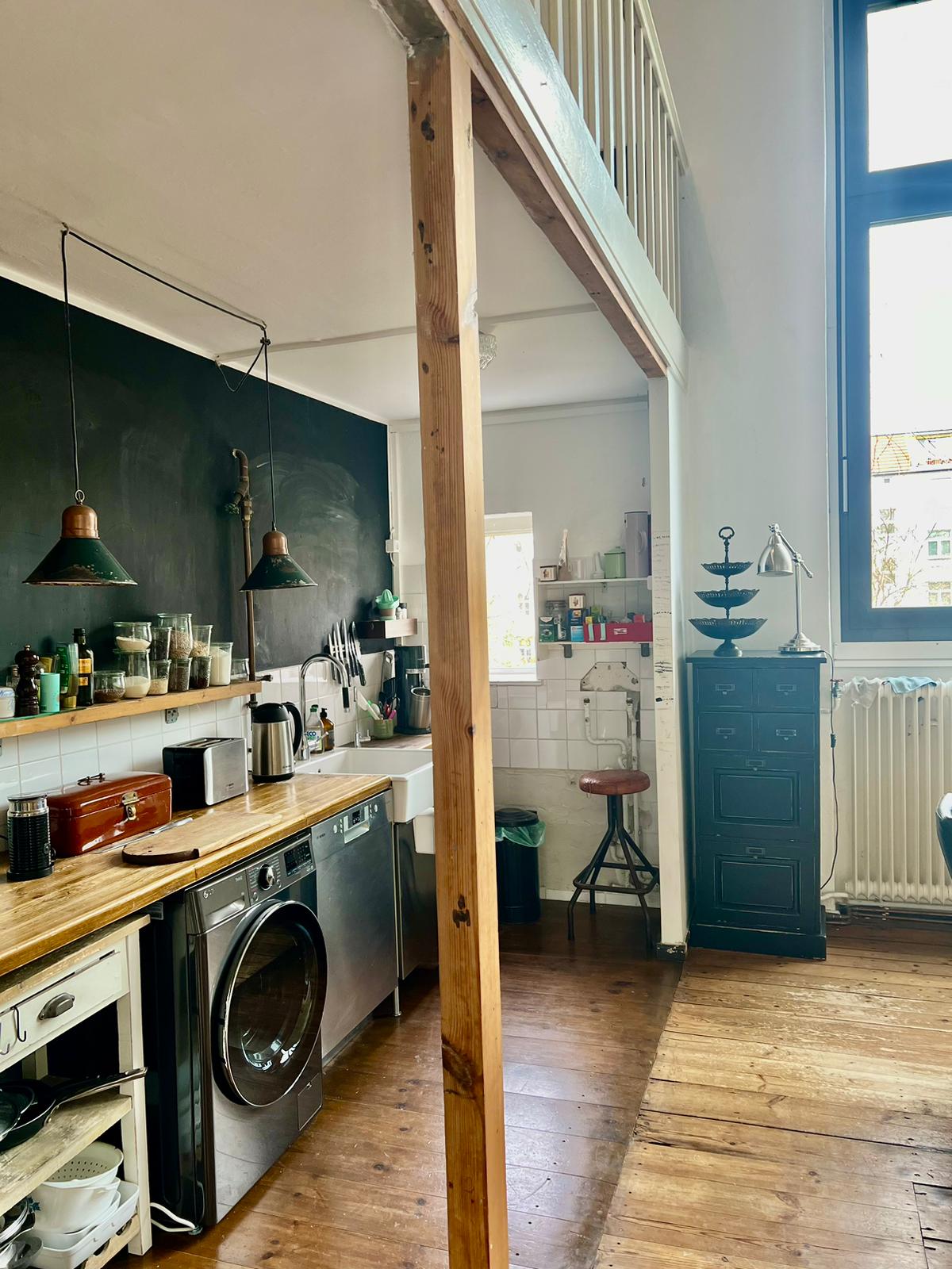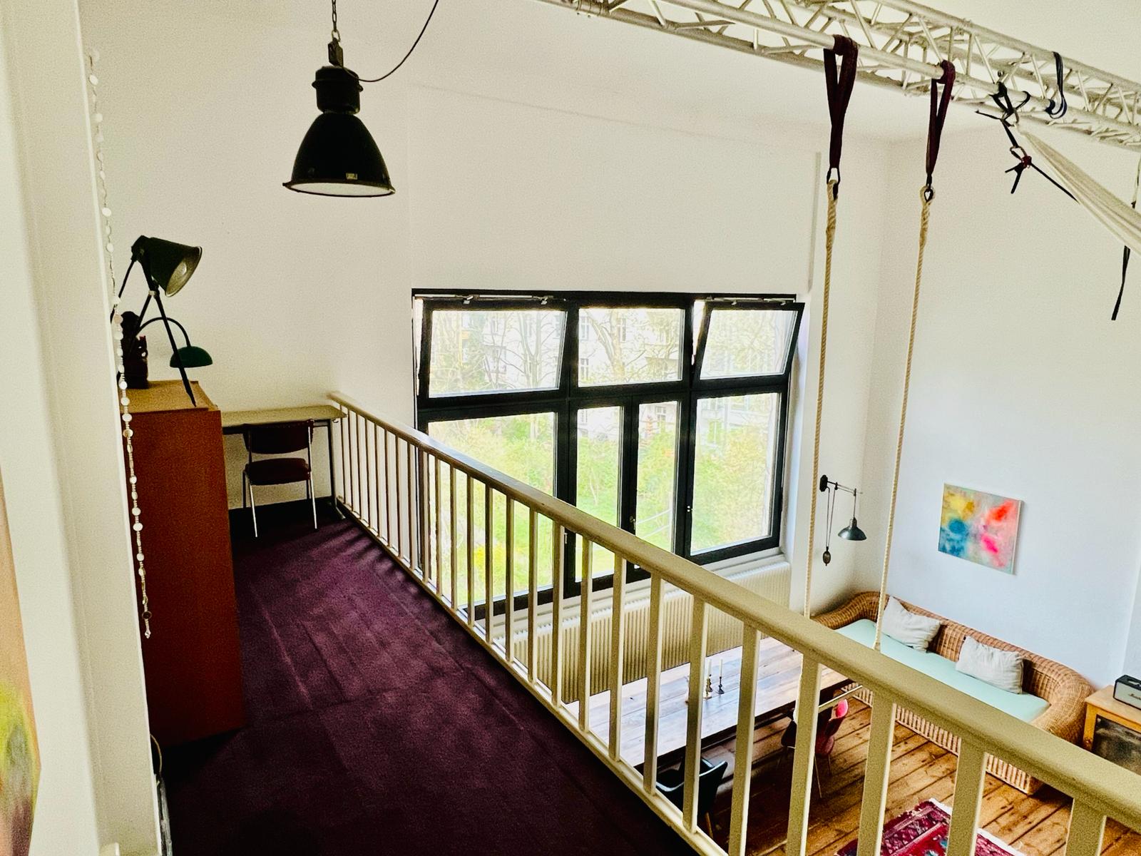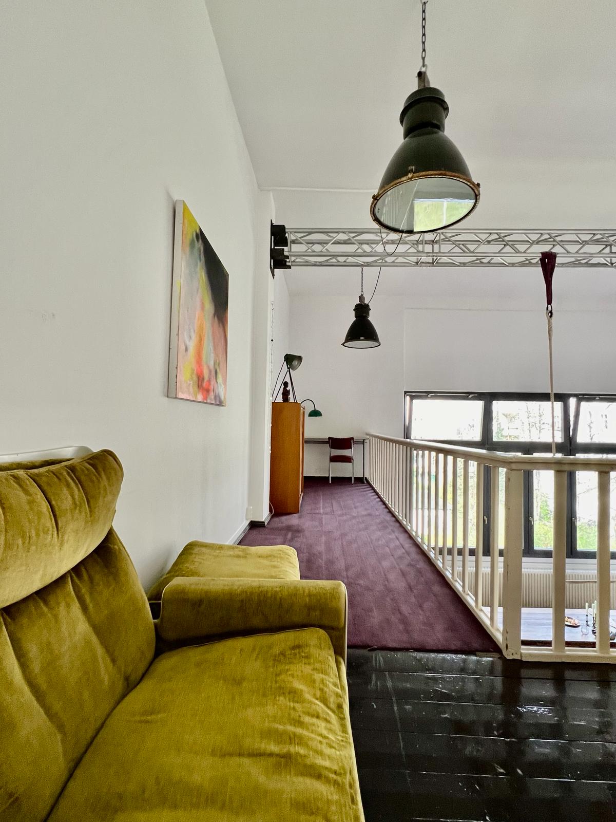Experimente una vibrante mezcla de confort moderno y estilo artístico en este espacioso loft. El corazón del apartamento cuenta con suelos de madera y grandes ventanales que bañan el espacio de luz natural, enfatizando la decoración ecléctica que incluye un llamativo sofá amarillo, un piano de cola y una exuberante alfombra roja. Ideal para entretenerse y relajarse, el salón se funde a la perfección con una cocina minimalista equipada con elegantes electrodomésticos y elementos rústicos, creando un refugio urbano perfecto.