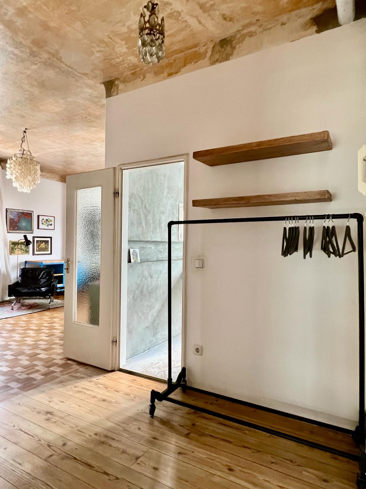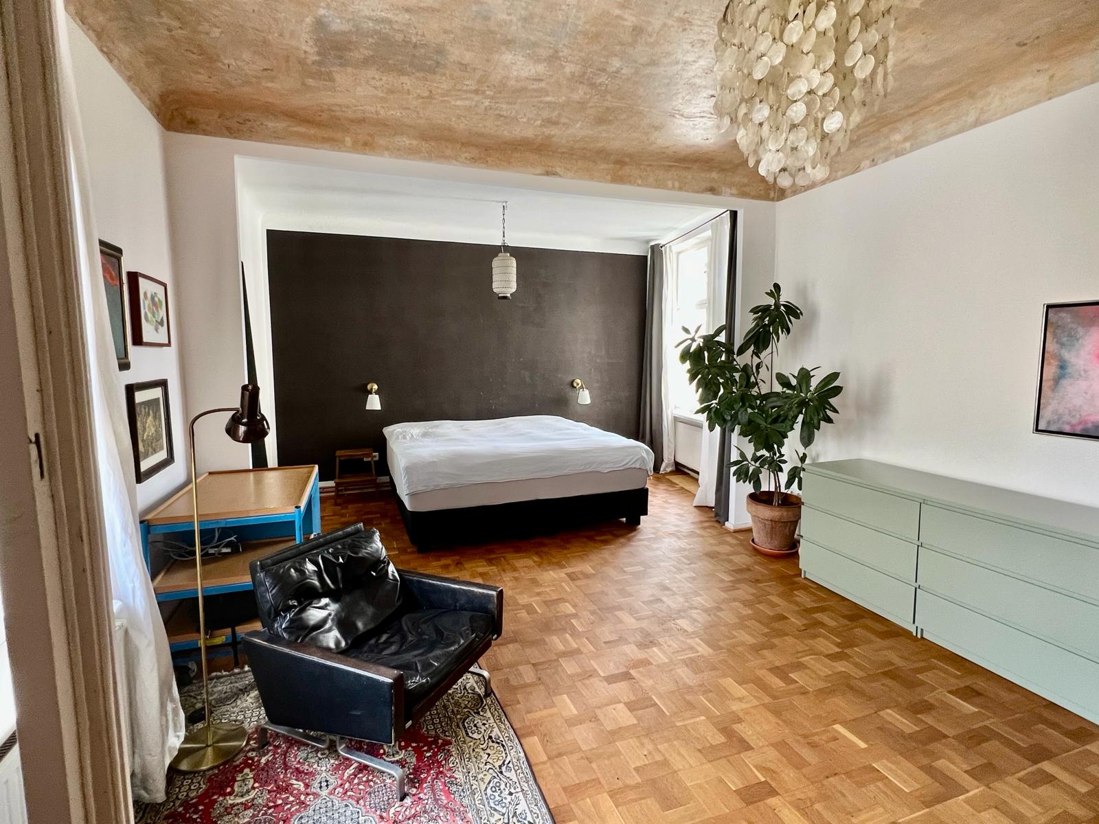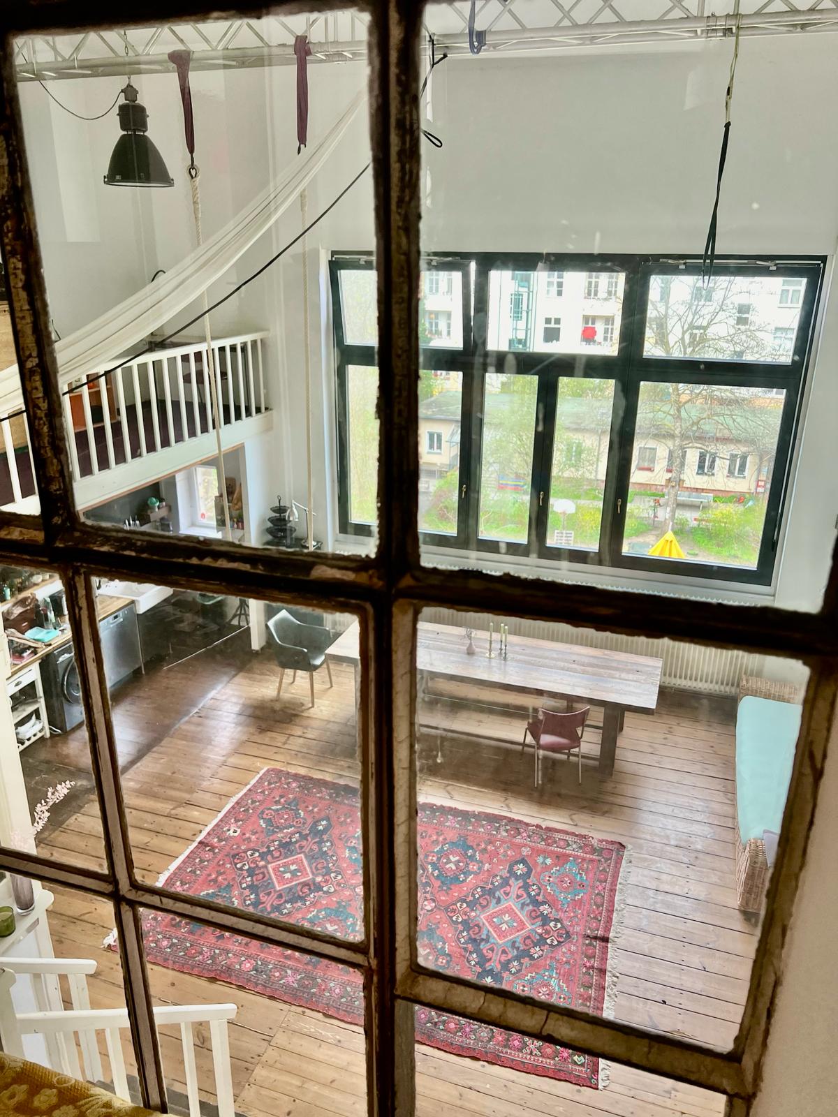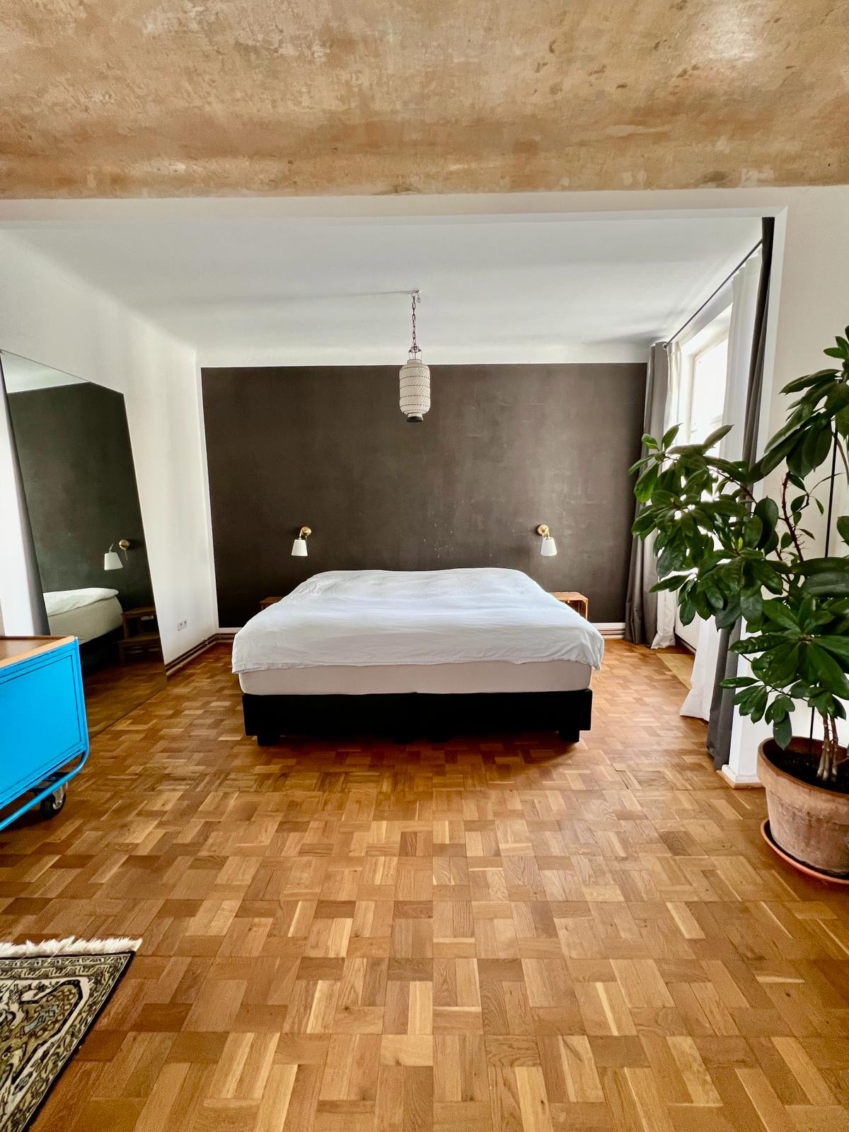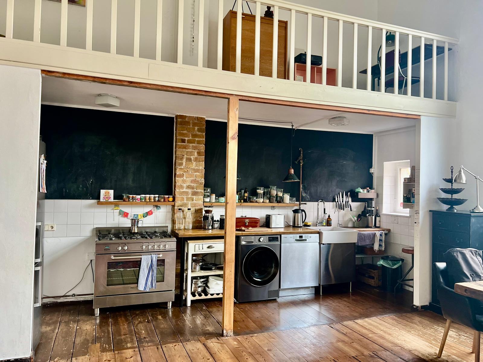 Experimente una vibrante mezcla de confort moderno y estilo artístico en este espacioso loft. El corazón del apartamento cuenta con suelos de madera y grandes ventanales que bañan el espacio de luz natural, enfatizando la decoración ecléctica que incluye un llamativo sofá amarillo, un piano de cola y una exuberante alfombra roja. Ideal para entretenerse y relajarse, el salón se funde a la perfección con una cocina minimalista equipada con elegantes electrodomésticos y elementos rústicos, creando un refugio urbano perfecto.