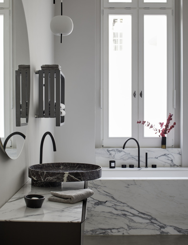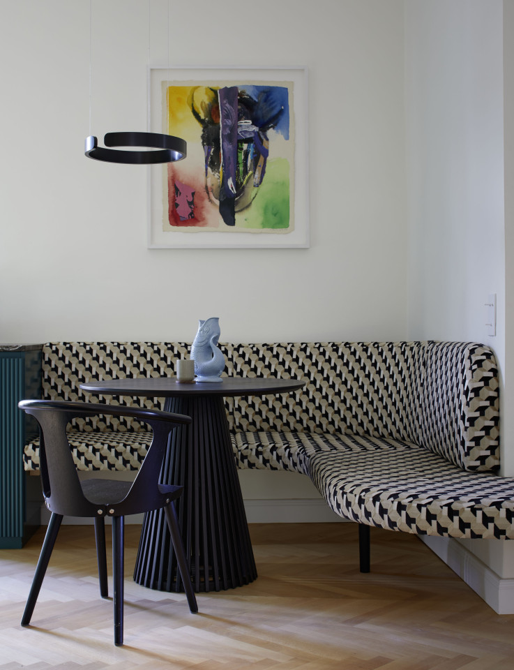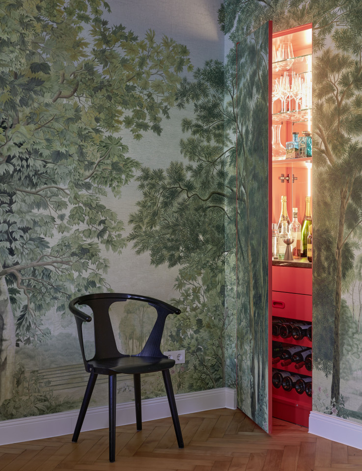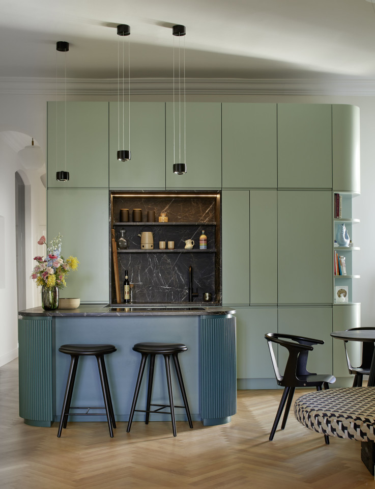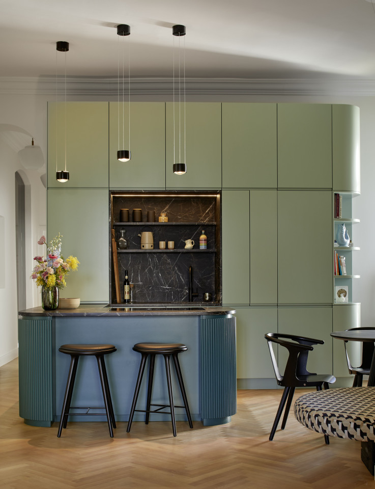 I pavimenti in parquet a spina di pesce e gli intricati dettagli in stucco aggiungono carattere storico, mentre i materiali caldi, gli accenti in legno naturale e i tessuti espressivi creano un'atmosfera accogliente e cinematografica. Il soggiorno e la sala da pranzo, luminosi e fluidi, offrono la possibilità di organizzare gli spazi in modo flessibile e sono completati da una cucina aperta, progettata in modo intelligente e dotata di ampi spazi di archiviazione.