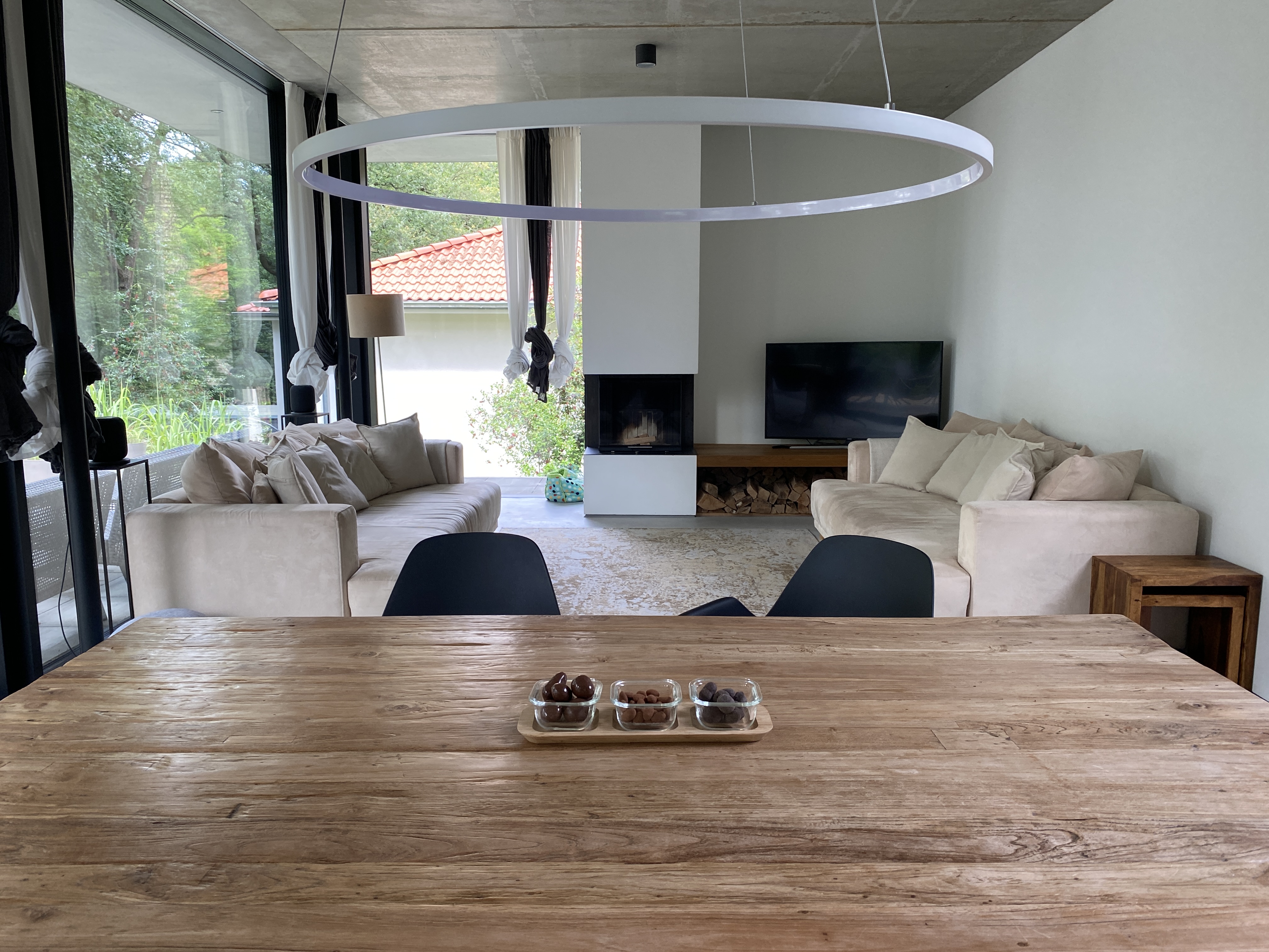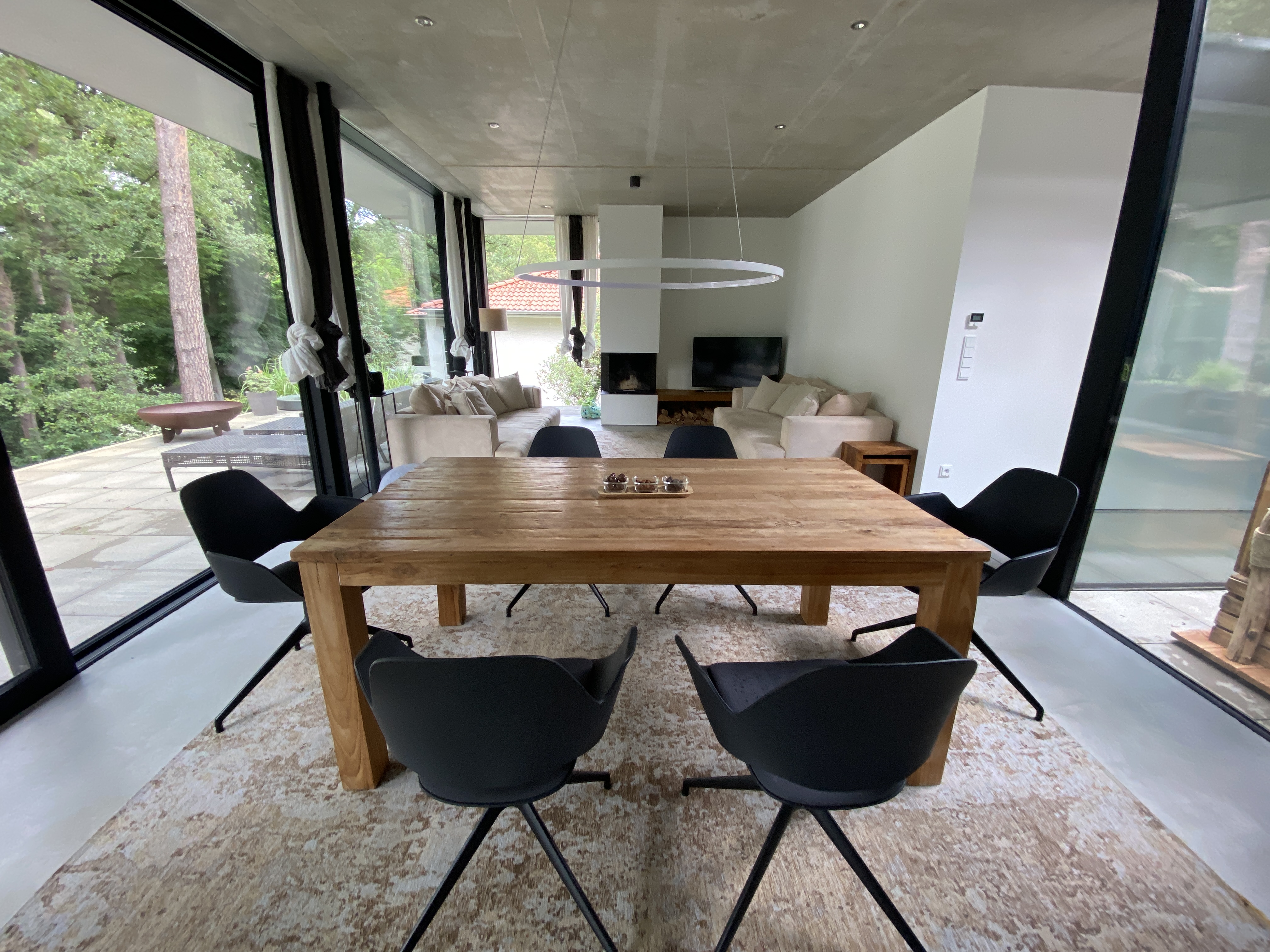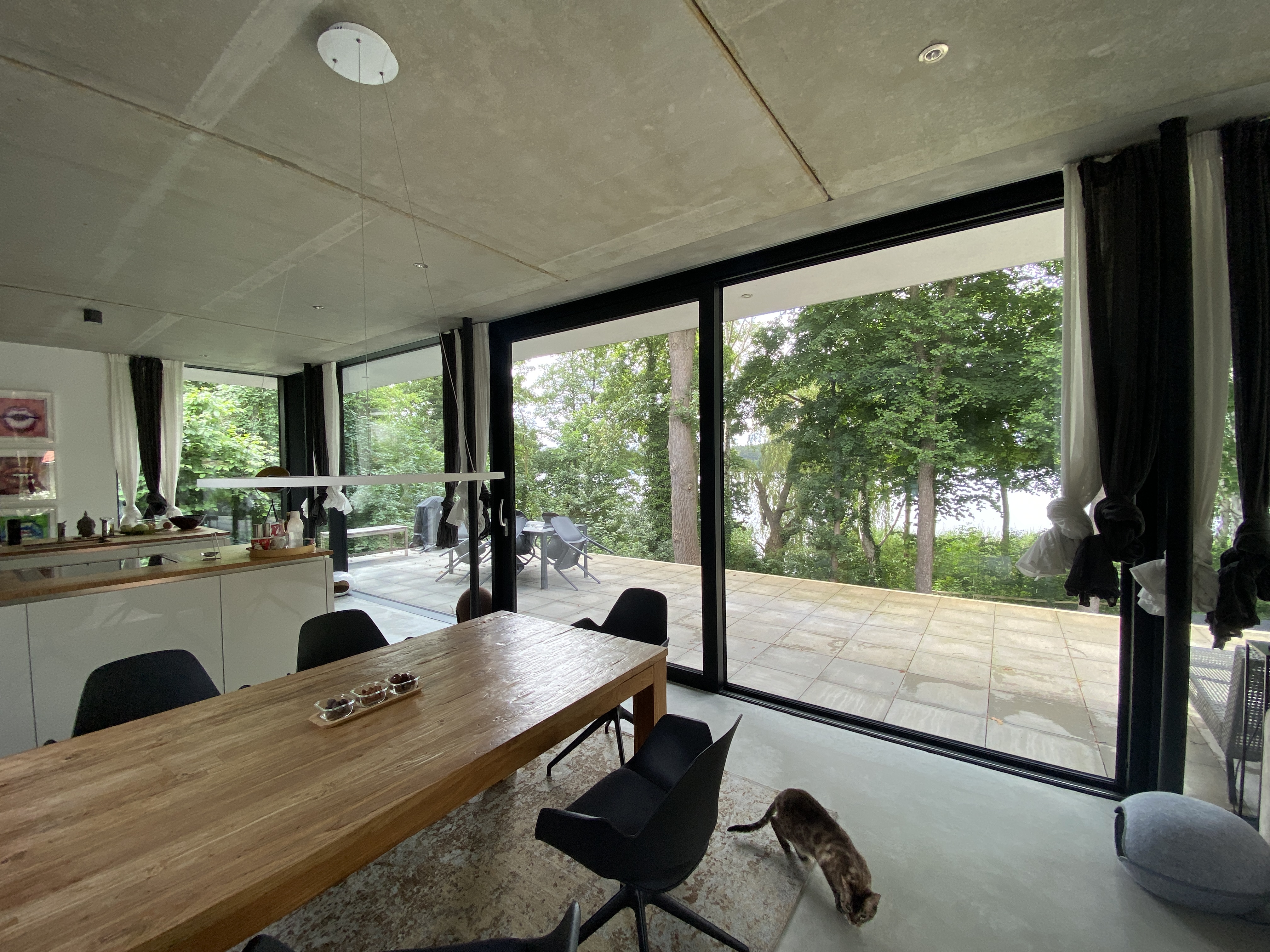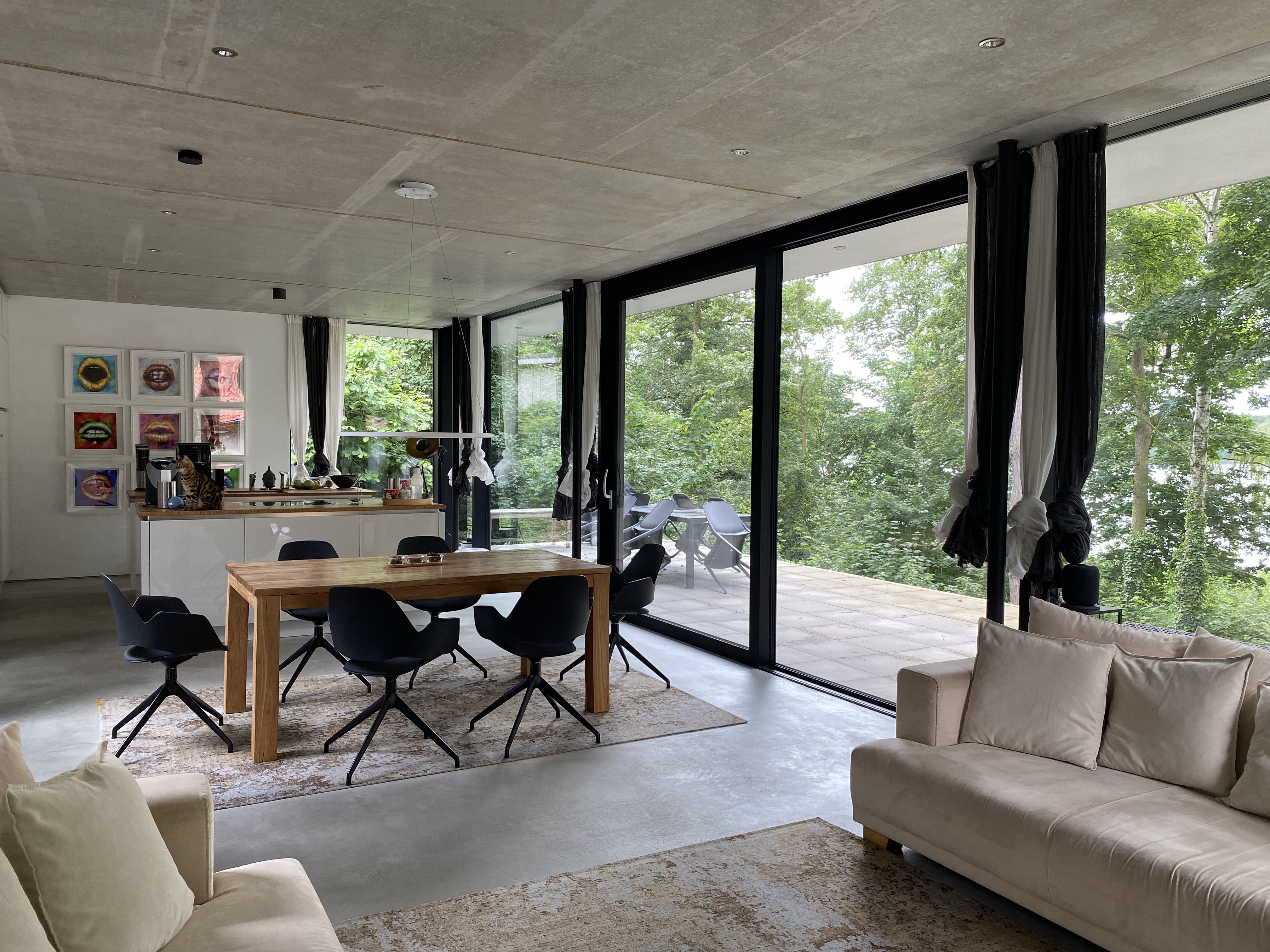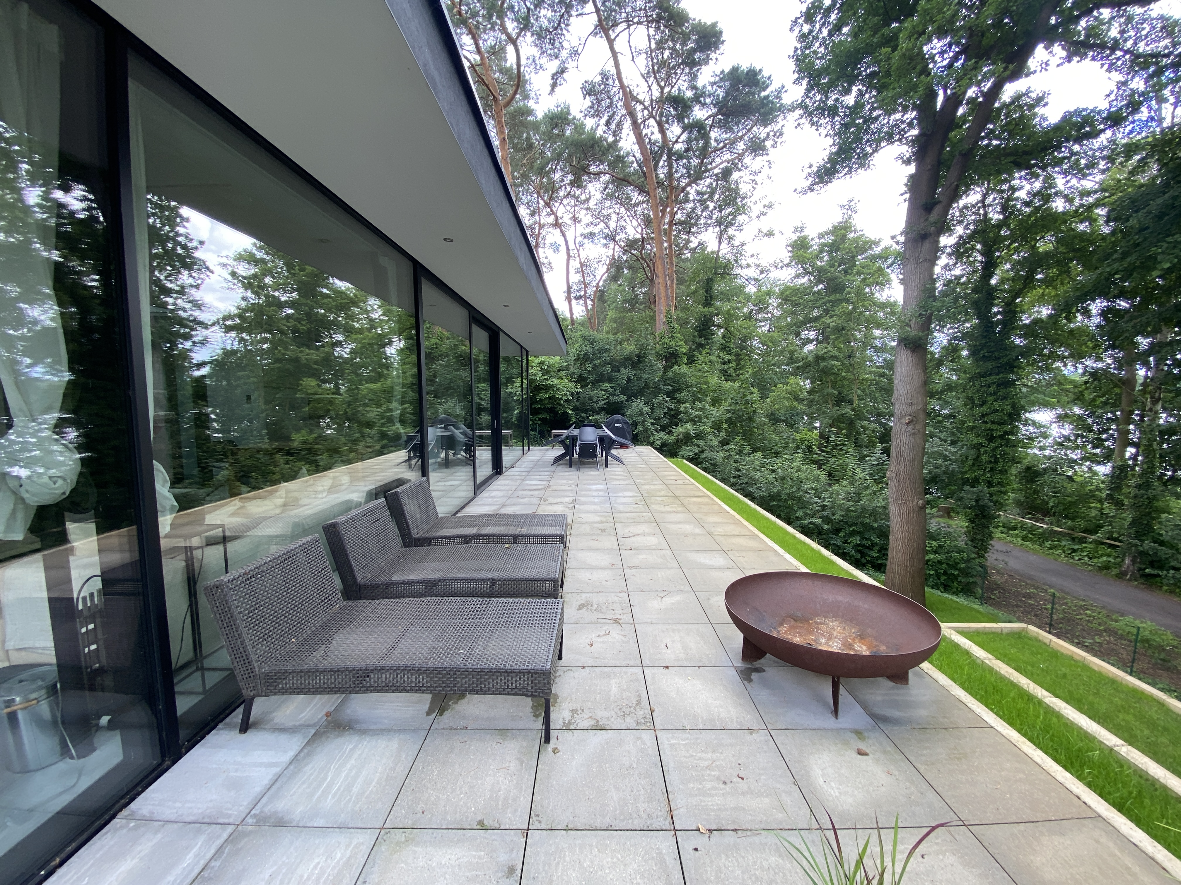 Immersa in un bosco sereno e costeggiata da un lago tranquillo, questa splendida casa moderna offre un perfetto connubio tra bellezza naturale ed eleganza architettonica. La casa è caratterizzata da ampie pareti vetrate che offrono una vista senza ostacoli sul verde lussureggiante e sul tramonto che si staglia sul lago, creando un ambiente di pace e tranquillità. Questa casa è stata progettata con un approccio moderno e minimalista, integrando finiture di alto livello come il legno lucido, eleganti elettrodomestici da cucina e spazi ampi e ariosi che si fondono perfettamente con l'ambiente esterno.