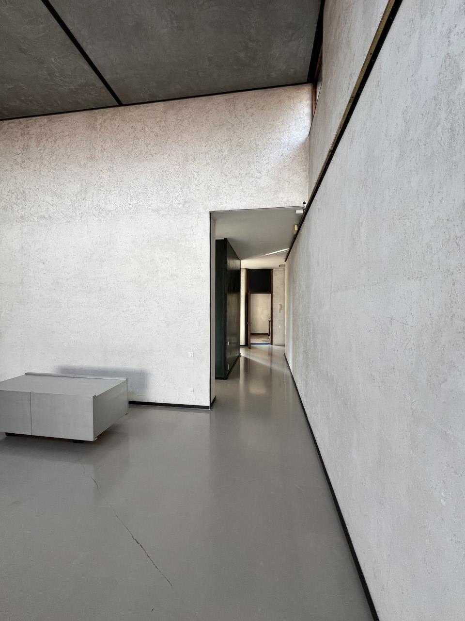 In tutto l'edificio, l'accento è posto su pareti materiche, superfici lucide e ombre drammatiche, esaltate dalla geometria degli angoli dei soffitti e dalle lunghe prospettive dei corridoi. Grandi finestre e linee architettoniche nette lasciano entrare la luce del giorno da angoli elevati, creando composizioni di luci e ombre che cambiano meravigliosamente nel corso della giornata. Alcune stanze sono quasi vuote, consentendo piena libertà di styling e di allestimento, mentre altre sono caratterizzate da divani in pelle nera, sedie in velluto verde, tavoli da pranzo e sezioni rivestite in legno, che conferiscono un tocco artistico e curato a uno spazio altrimenti neutro.