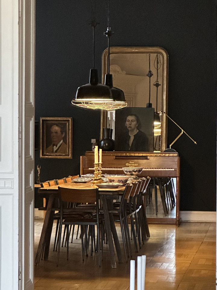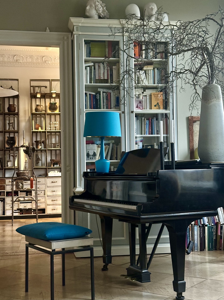 The ambience breathes history: things gathered from many corners of the world, fished out of the stream of time with an inspired eye and a sure hand. African sculptures; secretive portraits of unknown women and men; picture islands of island pictures, cloud pictures, water pictures; fragile folding chairs from a Roman palazzo; seating furniture by Vitra, cool and comfortable; a heavy baroque chest; shimmering giant trays and dining tables that were once market stalls. Four oak display case metres from a Hanseatic trading office as working storage and fundus; another: the audacious book installation. For the sake of sound, a Steinway grand piano from New York, a piano by Gaveau from Paris, underscoring subversive gatherings of pale blue and ultramarine. A variety of found objects and modernity is brought into a unique creative dramaturgy with intervals of spaciousness and emptiness. Well-calculated correspondences emerge at the temporal, stylistic and functional breaking points: things are made to speak and harmonise in unexpected ways. A cosmos of surprises awaits the visitor, right down to the smallest details. You can explore it more or less deeply - or simply enjoy it.