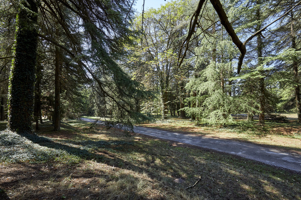 Inside, the spaces are generous, warm, and atmospheric. The main living areas feature stone walls, exposed wooden beams, vaulted ceilings, and a refined mix of antique furniture, classic décor, and neutral textiles. The living room includes period pieces, a grand piano on a raised platform, traditional chandeliers, and large windows overlooking the gardens. Another main interior area showcases a modern–rustic aesthetic with glass partitions, natural stone walls, concrete floors, and wooden elements, creating a bright and versatile environment.