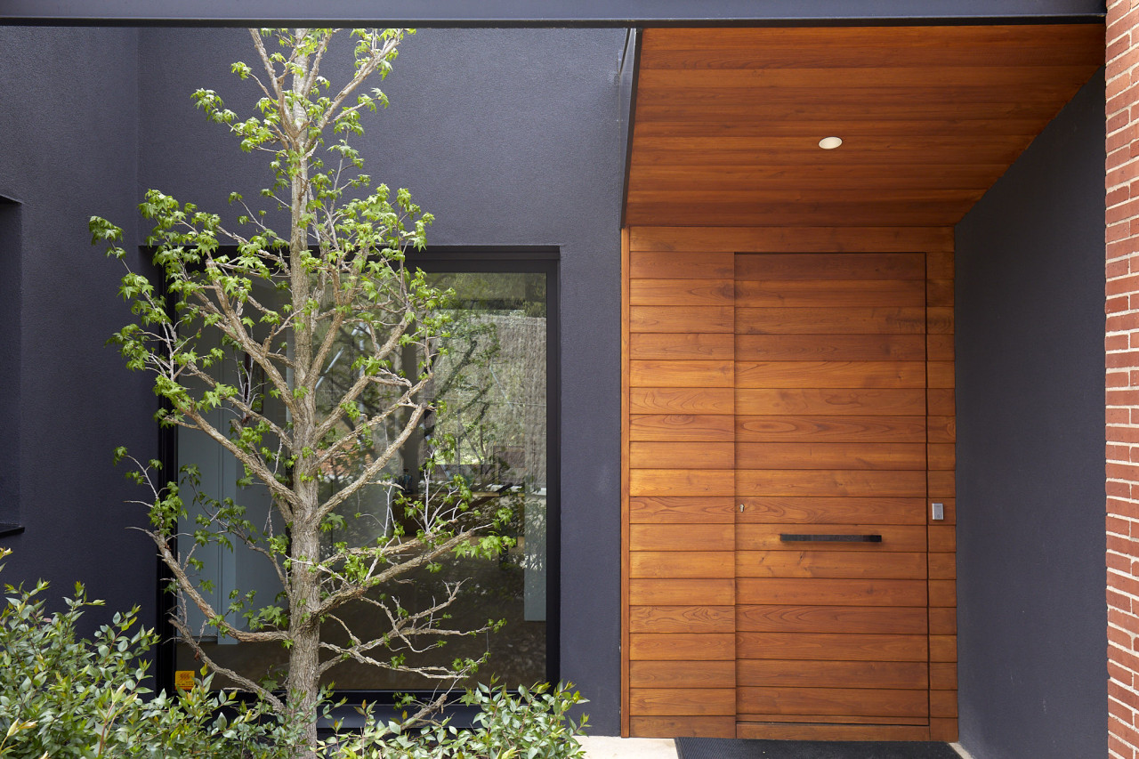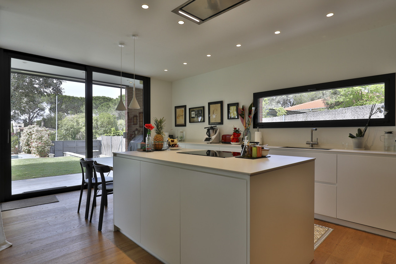 Inside, the home embraces a refined minimalist aesthetic enriched by warm wood flooring, curated décor, and statement lighting. The kitchen blends high-end finishes with practical design, from matte cabinetry and integrated appliances to the spacious island framed by views of the garden. The dining and living areas maintain an open flow, furnished with modern pieces that complement the home’s architectural language without overwhelming it.