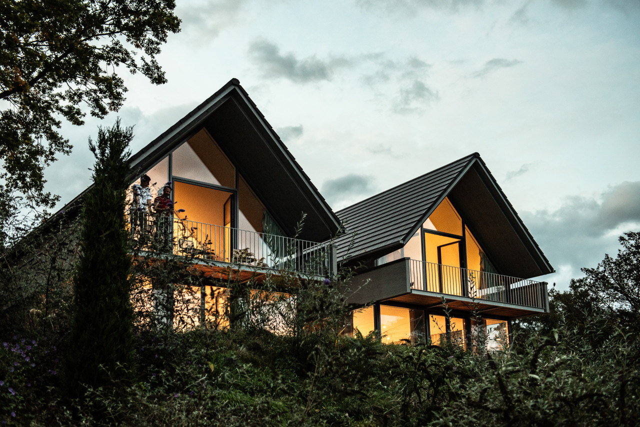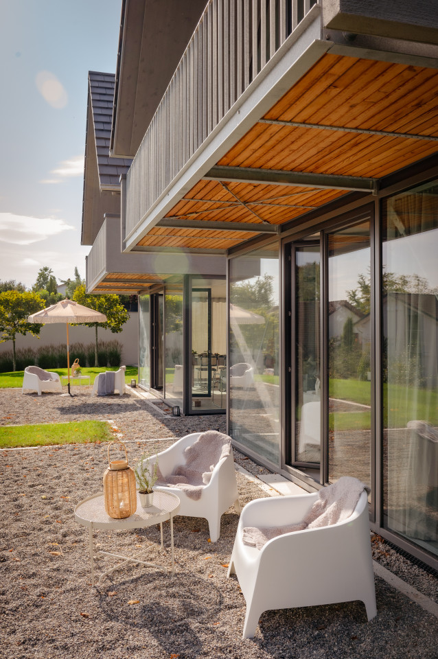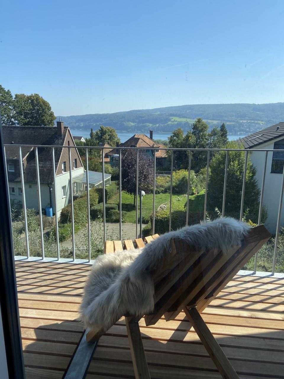 Two new architectural houses with fantastic lake views with light-flooded rooms, glazed all-round, open design, sloping ceilings and high rooms on the upper floor. Still with a cozy atmosphere thanks to clear, muted colors and fine fabrics in Scandinavian style. High-quality and perfectly crafted installations such as floor-to-ceiling cupboards and an open, free-standing kitchen. Free-standing bathtub in the gallery on the upper floor. Two bathrooms, each with a rain shower. Balconies with lake views and terraces with access to a small garden. Parking spaces directly on the property. Very quiet and green residential area. You can reach the lake in 5 minutes on foot, small bays invite you to swim.