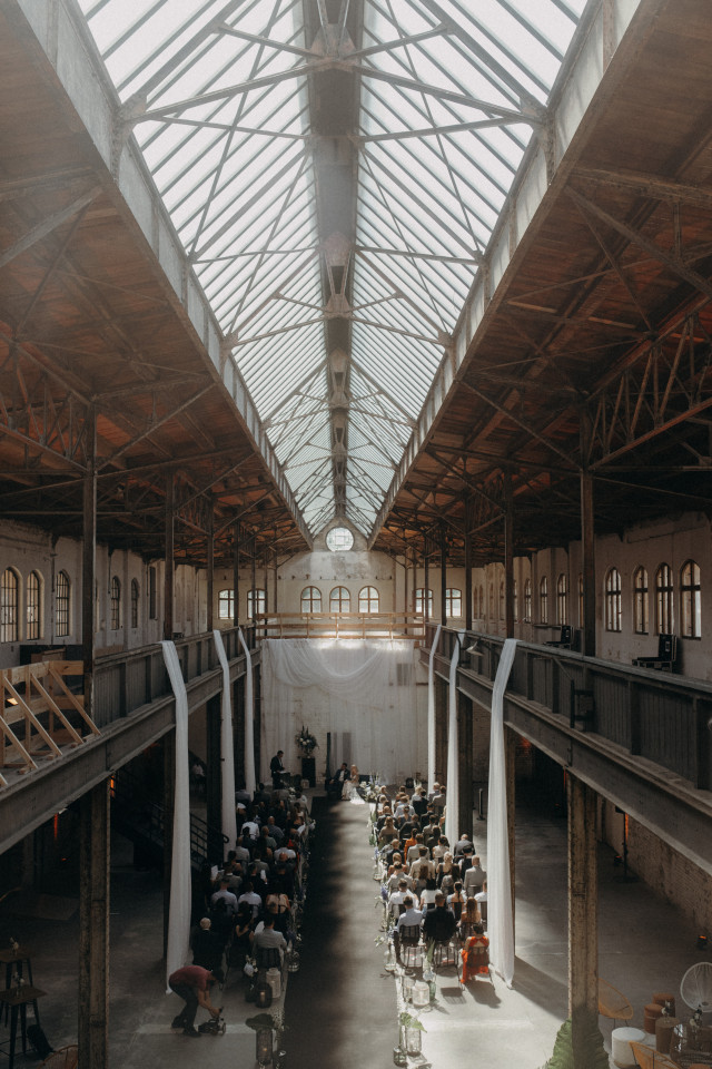 This historic industrial complex in Berlin combines 19th-century brick architecture with expansive factory halls and authentic industrial details. Its soaring ceilings, steel beams, exposed brickwork, and large arched windows create a distinctive atmosphere, with abundant natural light during the day and striking potential for evening lighting. Catwalks, staircases, and preserved machinery add cinematic character while offering flexibility for events, stage design, and installations.