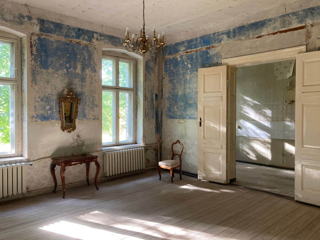 The manor, a classical estate dating from around 1820–1850, stands in an authentic, raw condition after 20 years of vacancy. Surrounded by a small avenue and a sprawling park with mature trees, the property enjoys a quiet village-side location — almost undisturbed and ideal for filming.