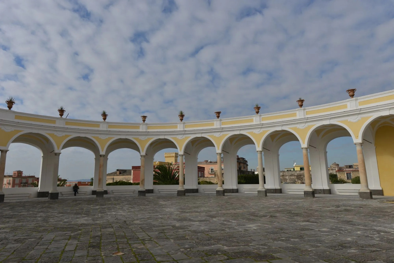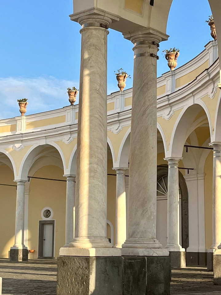 The images showcase a curved façade lined with grand porticos, symmetrical arcades, and open courtyards—each detail echoing the elegance of 18th-century Neapolitan design. The stone-paved square and monumental staircases offer dynamic depth for wide-angle shots and structured compositions. These public spaces are visually clean yet richly textured, ideal for choreographed movement, tracking shots, or product-focused layouts.