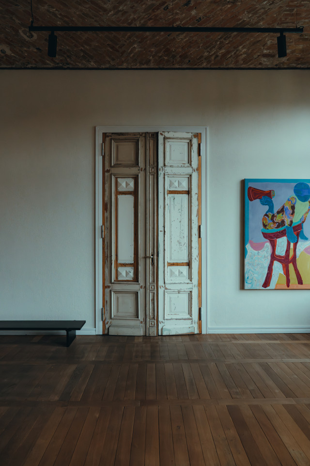 Een ruime, lichte loft met een opvallende mix van parket- en terrazzovloeren, aangevuld met een unieke open keuken gemaakt van 120 jaar oude houten balken.