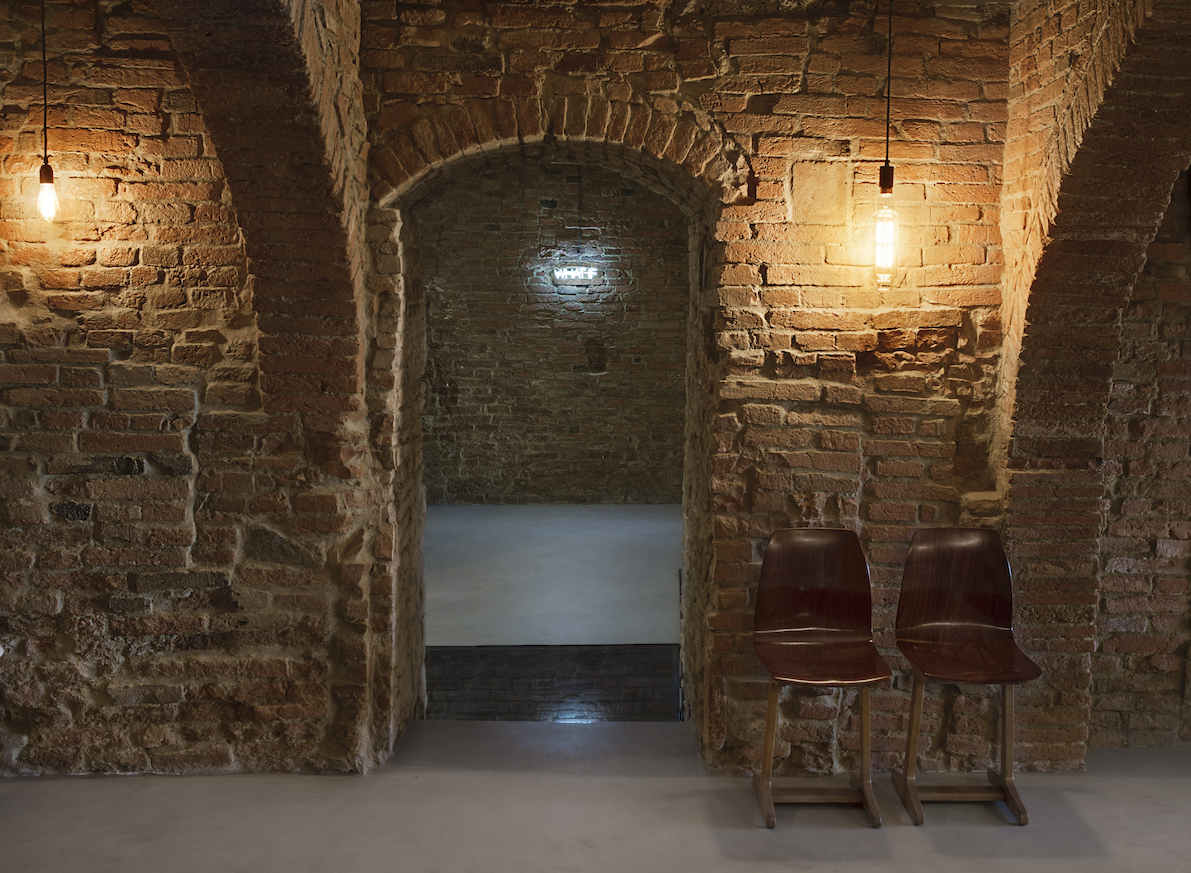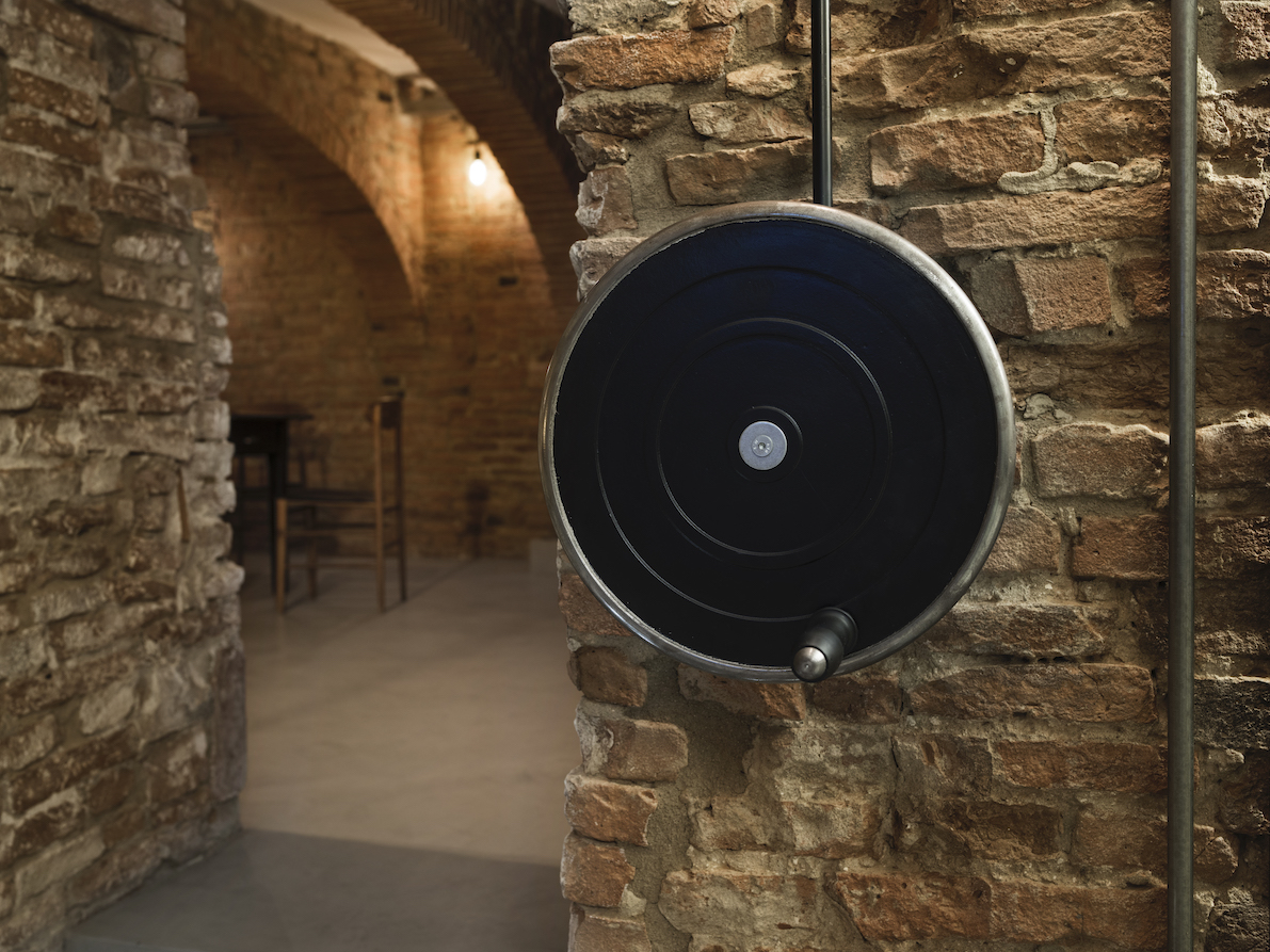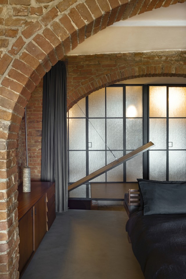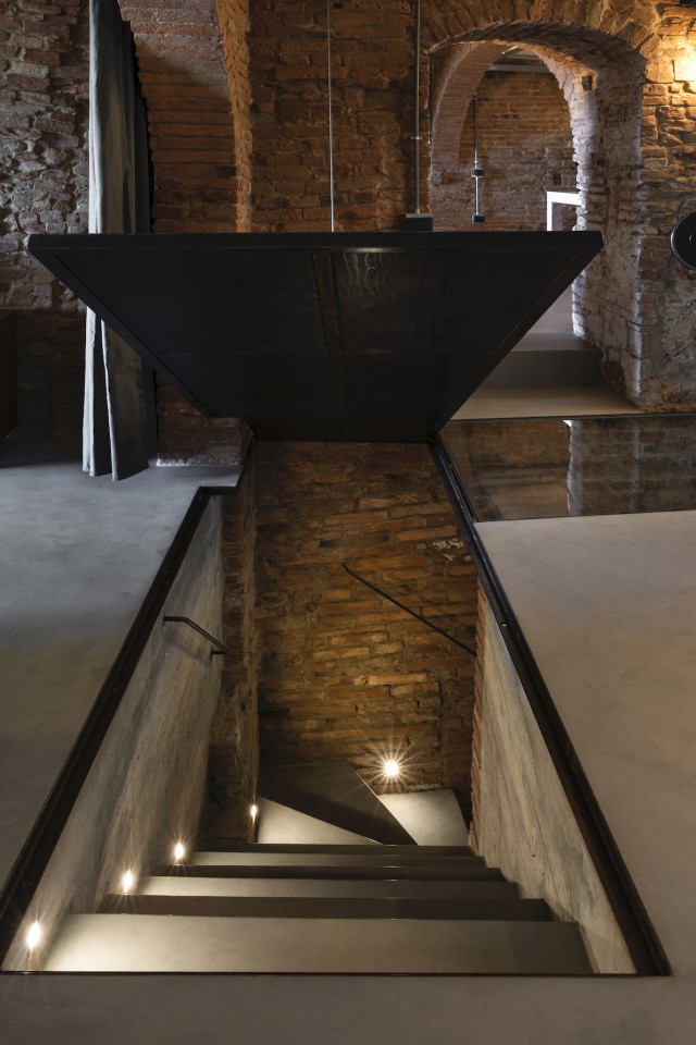 Ontworpen om het gevoel van mysterie en ontdekking te versterken, evenals de privacy, kan het ondergrondse niveau volledig worden afgesloten van de kamers boven. Een gigantische intrekbare vloerluik, gelijk met de vloer van de hoofdslaapkamer'kan naar believen worden geopend door een op maat gemaakt mechanisch systeem dat naadloos een industriële esthetiek integreert in het oude metselwerk van baksteen en mortel. Terwijl het de veelzijdigheid van de hele ruimte maximaliseert, is het kinetische systeem ook bedoeld om een element van speelsheid en verrassing te introduceren: de vloer draait en kantelt plotseling omhoog door een met de hand aangedreven zwengel die met de vloer verbonden is via een set op maat gemaakte tandwielen - zo soepel en lichtgewicht dat zelfs een kind het met gemak kan hanteren.