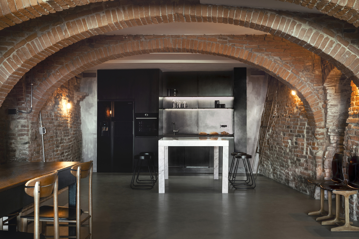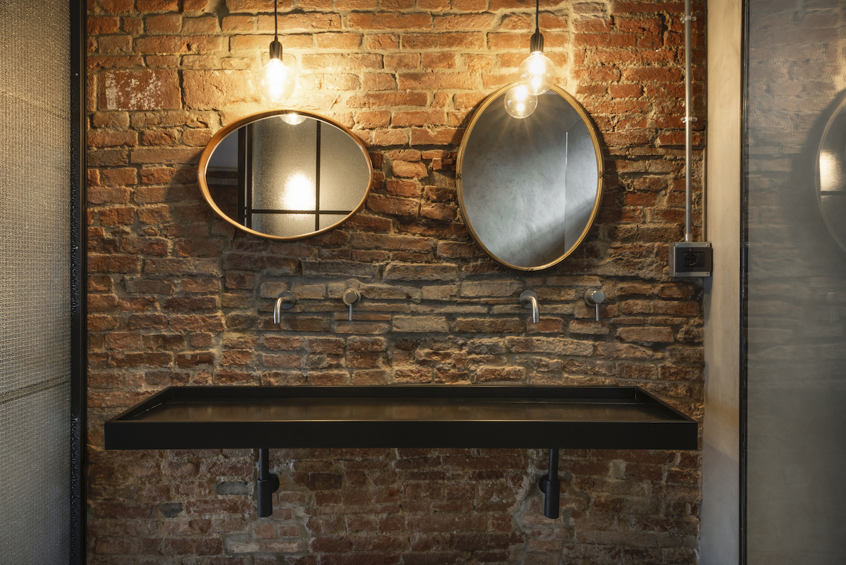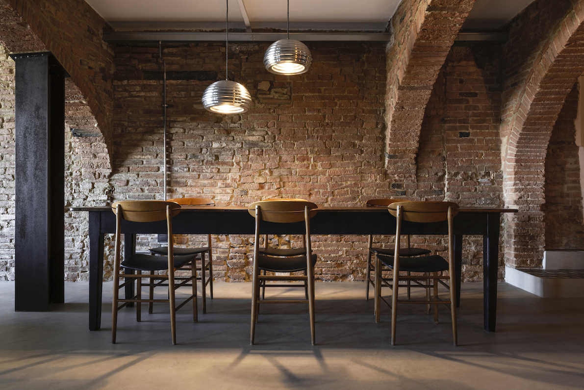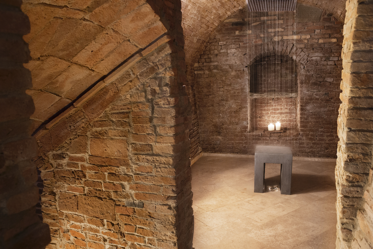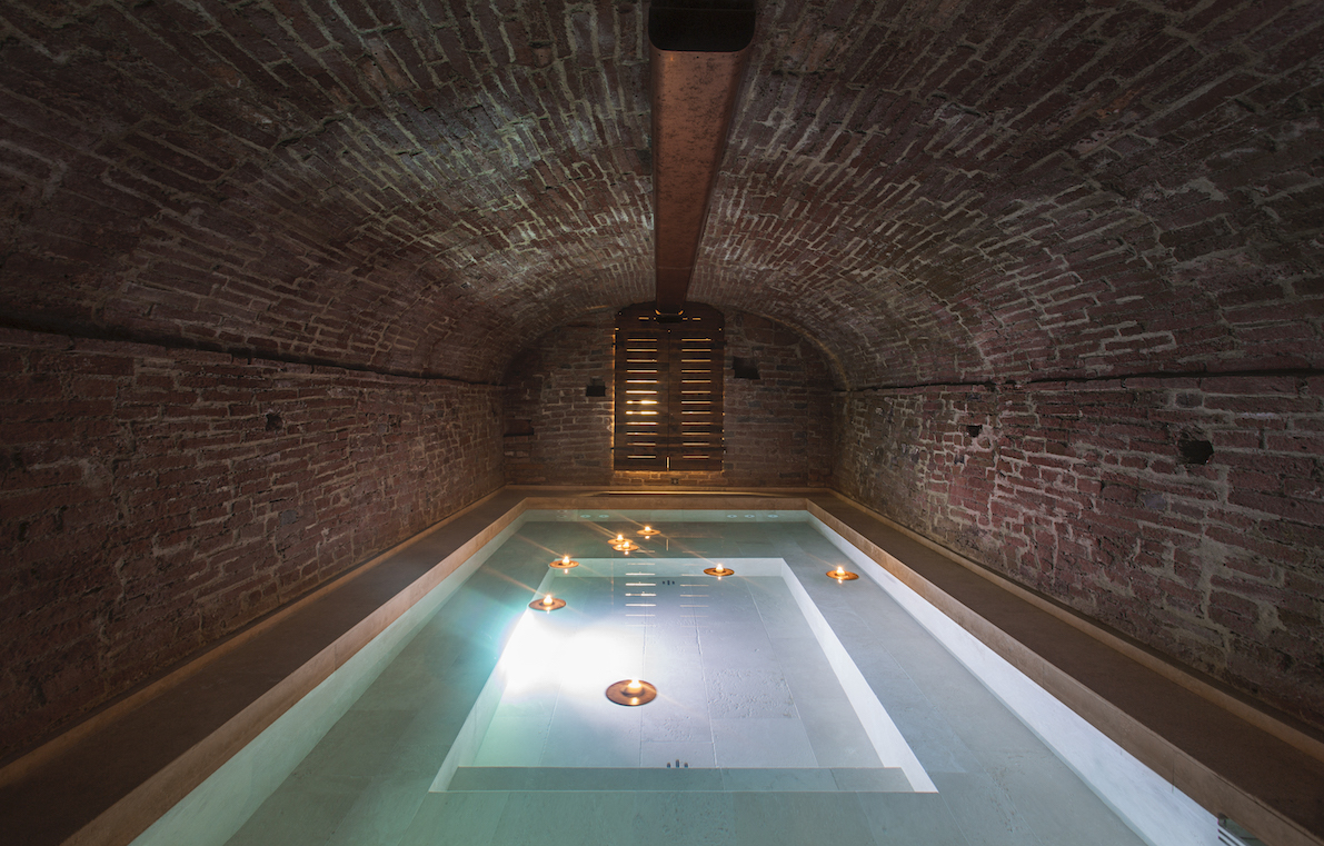 Tussen de twee vleugels leidt een verborgen trap je verrassend genoeg naar het oudste deel van het gebouw: een privéspa met een ondergronds zwembad en een regendouchekamer onder gewelfde gemetselde plafonds.
