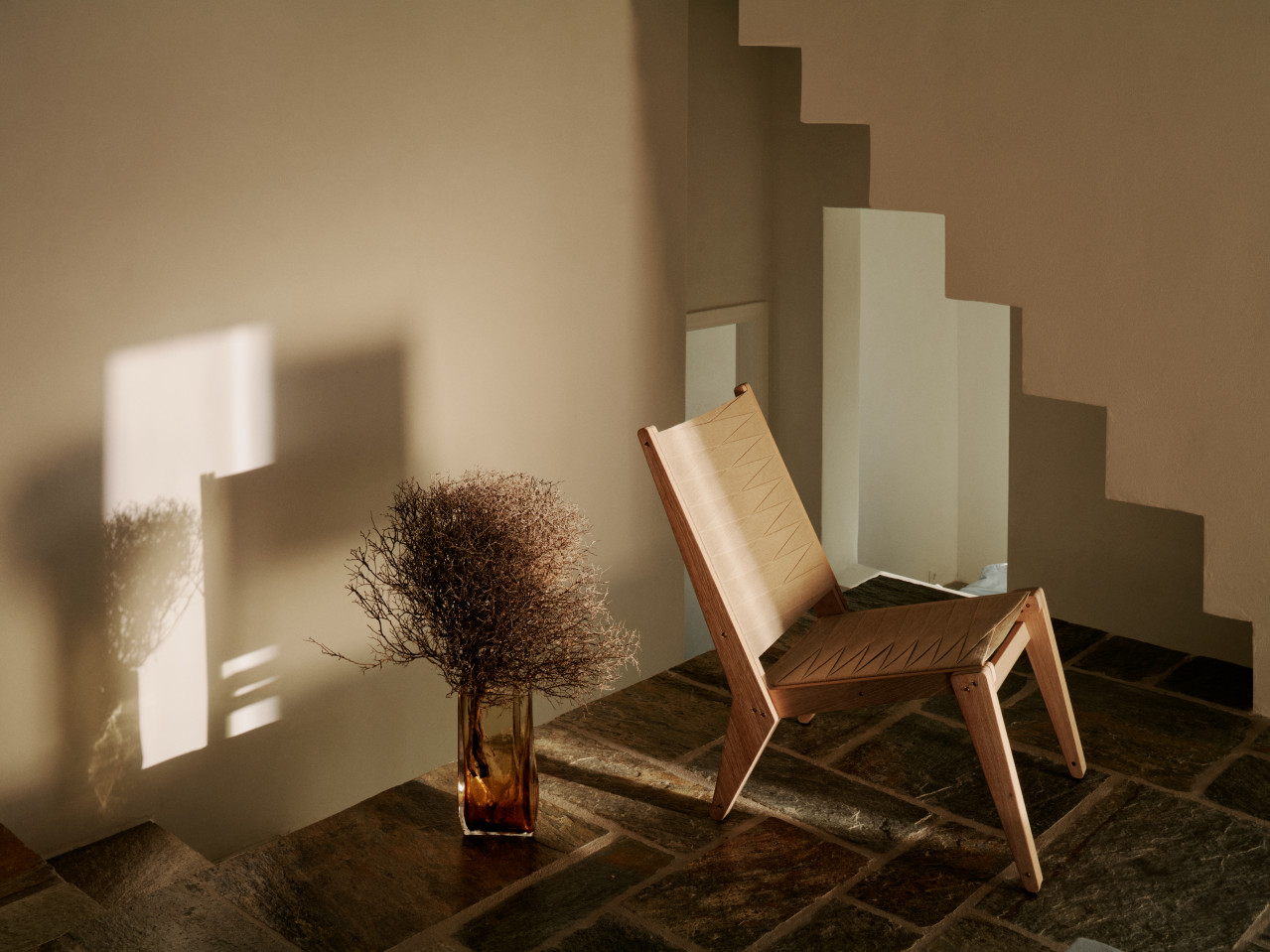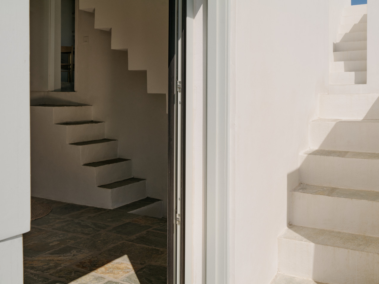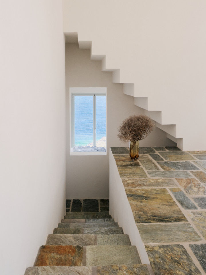 Zowel binnen als buiten creëren de witte trappen op speelse wijze een cirkelvormige stroom door de verschillende niveaus van het huis. Geïnspireerd door het werk van M.C. Escher kan men zich boven, onder en door de ruimte bewegen in een bijna oneindige lus van treden. Het cluster van vier witte kubussen is genesteld in de heuvel op verschillende hoogtes en biedt meerdere panoramische uitzichten op de omliggende eilanden. De aanwezigheid van de Cycladische archipel en de steeds veranderende tinten van zee en lucht kunnen vanuit elke hoek van het huis worden ervaren. Van binnenuit is het kleine, onbewoonde eiland Piperi perfect te zien vanuit alle drie de bedden, het bad, de eettafel en de bank. De terrassen verbinden niet alleen de verschillende ruimtes, maar benadrukken ook het mediterrane landschap. Buiten zijn de daken van de witte kubussen toegankelijk als verhoogde plateaus boven het rotsachtige terrein.