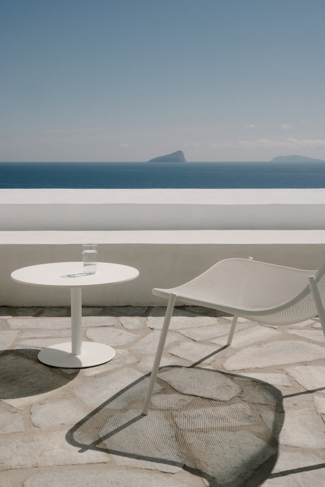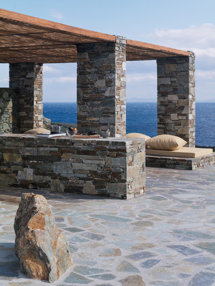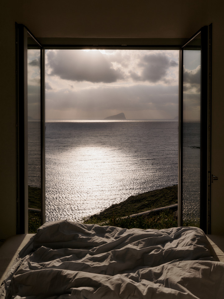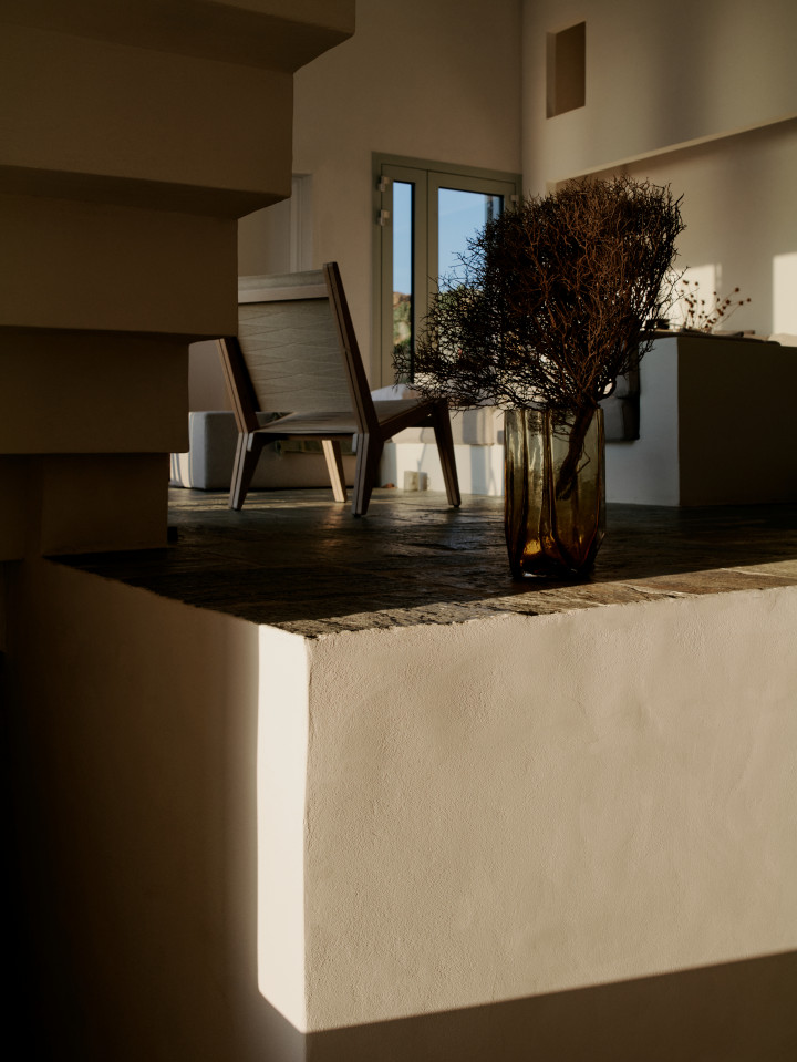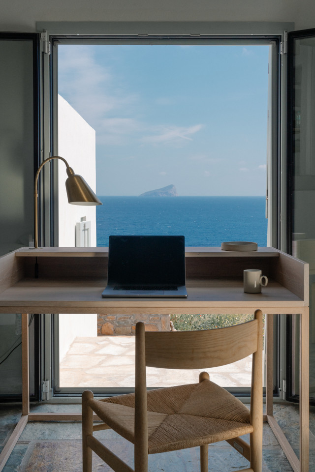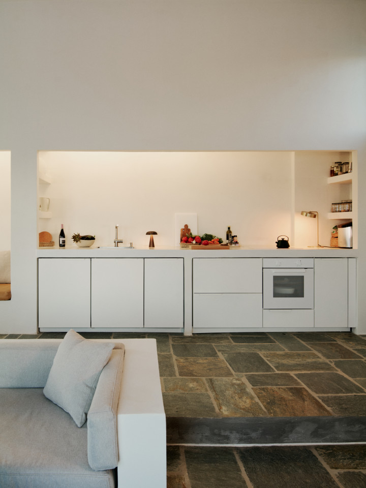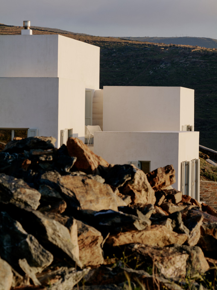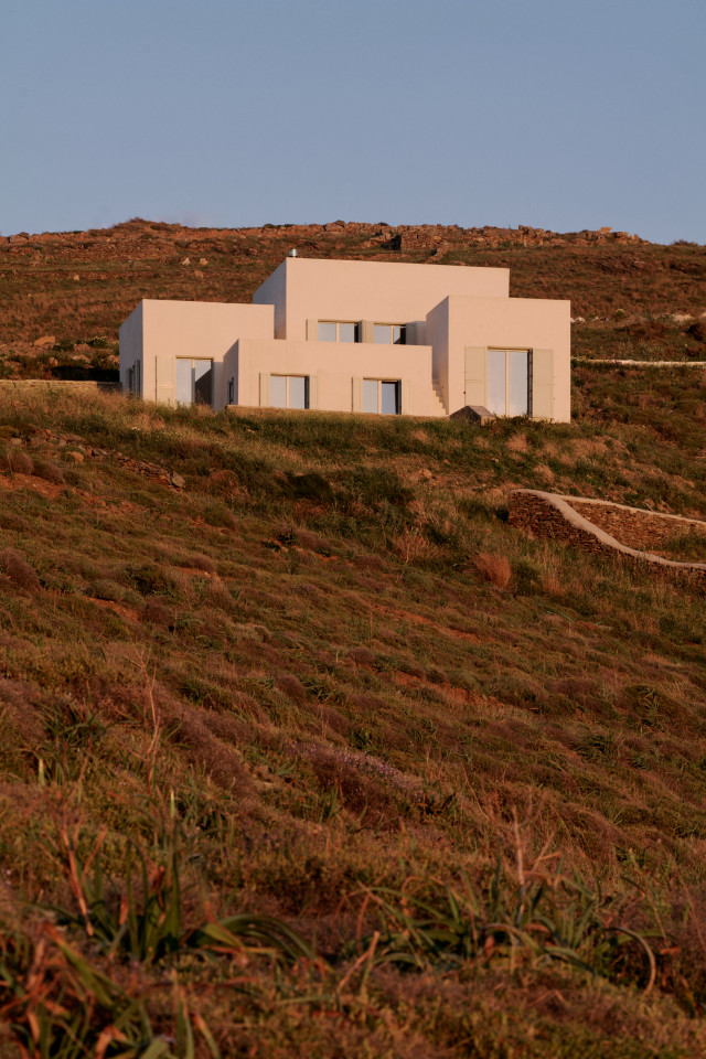 Dit prachtige huis op een heuvel ligt op een klein schiereiland dat zich uitstrekt van Kythnos eiland in de Egeïsche Zee, met uitzicht op de Cycladische archipel. Het huis is geïnspireerd op traditionele Cycladische dorpen en bestaat uit witte kubussen die met elkaar verbonden zijn door getrapte witte steegjes. Als een kristalheldere sculptuur gehouwen uit één stuk witte steen staan de monolithische volumes in opvallend contrast met het droge landschap van gebrande bruintinten en gedempt groen.