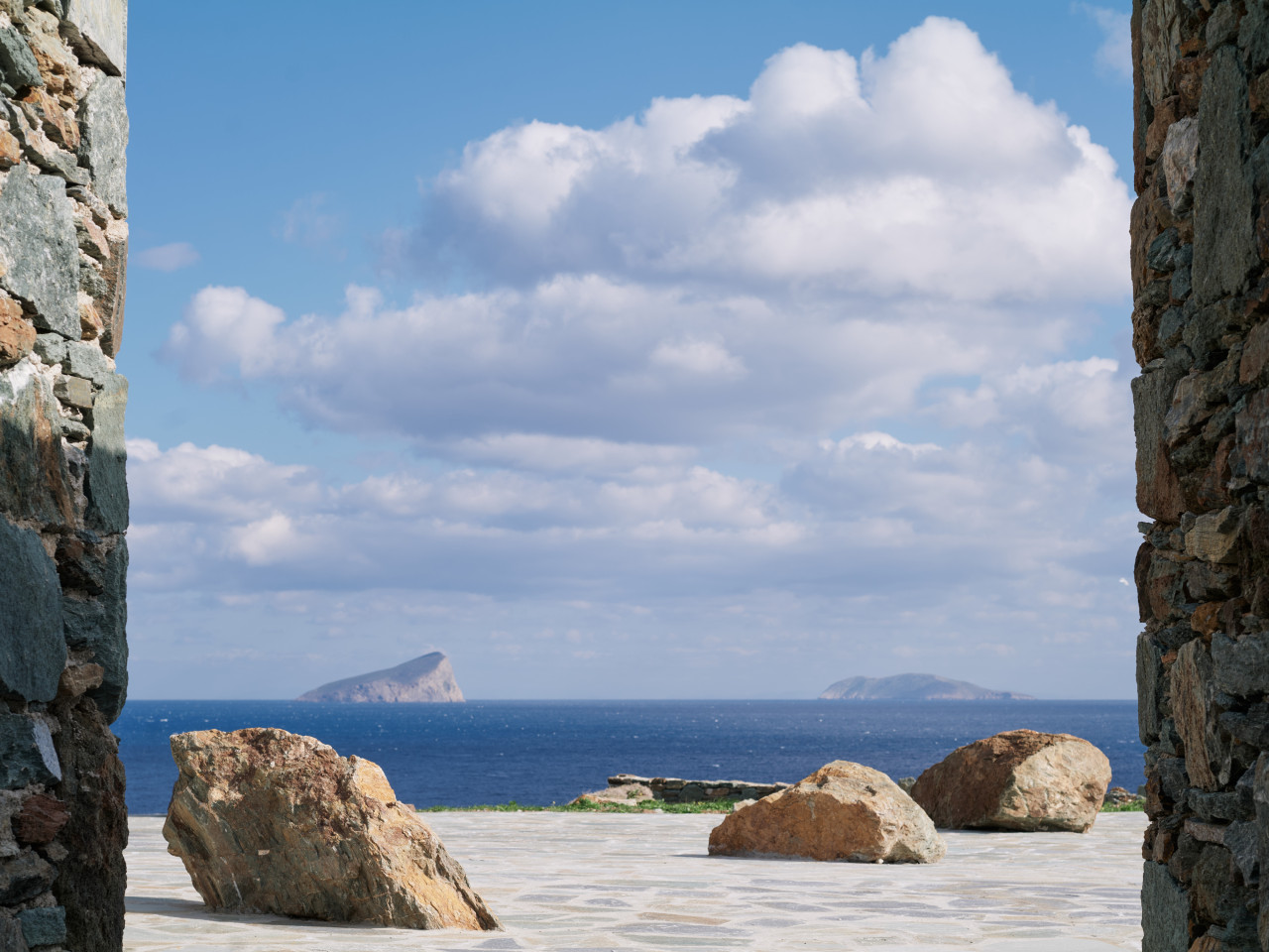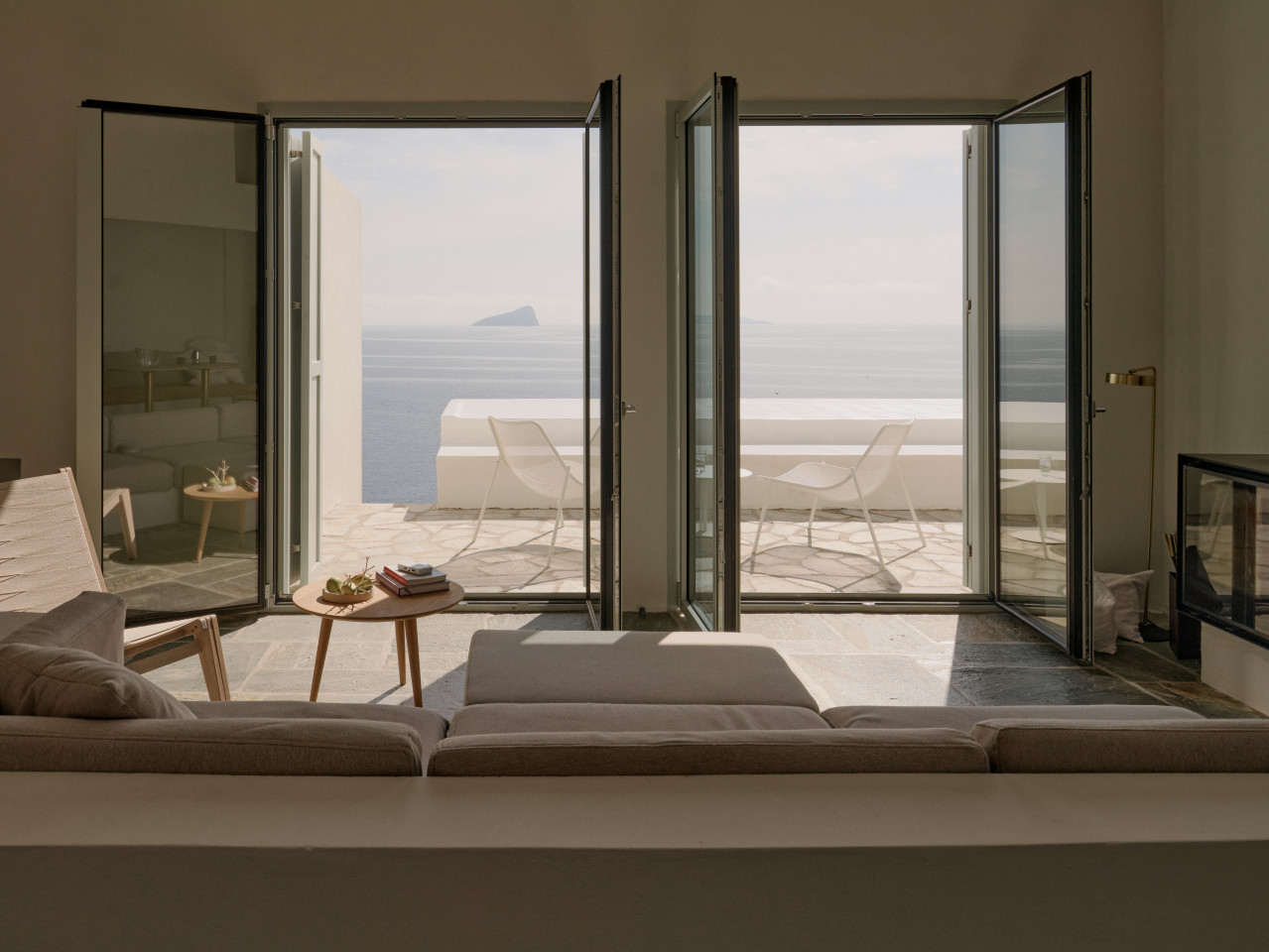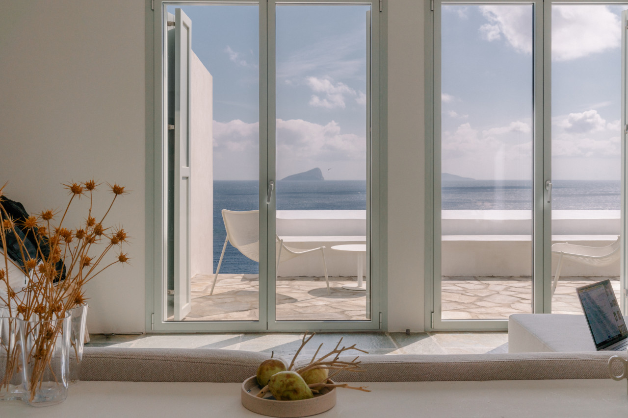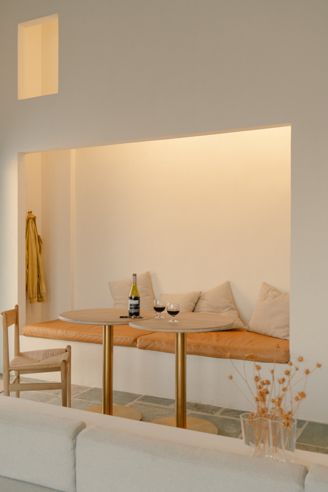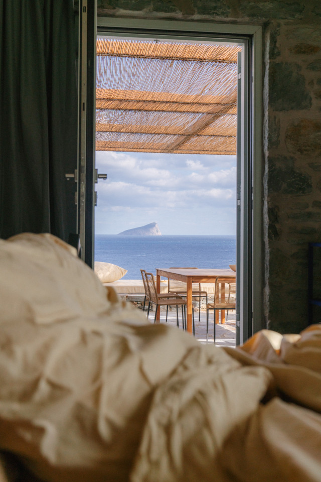 Dit prachtige huis op een heuvel ligt op een klein schiereiland dat zich uitstrekt van Kythnos eiland in de Egeïsche Zee, met uitzicht op de Cycladische archipel. Het huis is geïnspireerd op traditionele Cycladische dorpen en bestaat uit witte kubussen die met elkaar verbonden zijn door getrapte witte steegjes. Als een kristalheldere sculptuur gehouwen uit één stuk witte steen staan de monolithische volumes in opvallend contrast met het droge landschap van gebrande bruintinten en gedempt groen.